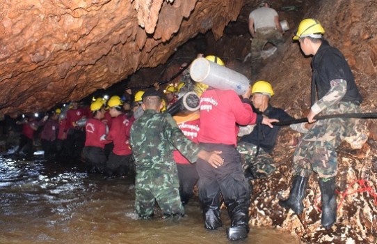 ตั้งแต่หลังเที่ยงคืนที่ผ่านมา เจ้าหน้าที่ได้นำผ้าใบปูทางเดินจากด้านนอกไปยังด้านหน้า ถ้ำหลวง-ขุนน้ำนางนอน จ.เชียงราย ขณะที่ภายในถ้ำ มีการเดินสายโทรศัพท์จากปากถ้ำ ไปยังบริเวณเนินนมสาว ซึ่งเป็นจุดที่นักเตะเยาวชนและโค้ชทีมหมูป่าอะคาเดมี่แม่สาย รวม 13 คนอยู่ เรียบร้อยแล้ว เพื่อให้ครอบครัวได้พูดคุยกับทีมหมูป่า ซึ่งระยะทางจาก ปากถ้ำไปจนถึงเนินนมสาว ประมาณ 4 กิโลเมตรเศษ นอกจากนี้ เจ้าหน้าที่ได้นำหน้ากากออกซิเจนเข้าไปยังจุดเนินนมสาวเรียบร้อยแล้ว เพื่อให้หน่วยซีลฝึกให้เด็กๆ ใช้หน้ากากออกซิเจนสำหรับดำน้ำ โดยซีล 1 คน จะประกบ สอนเด็ก 1 คน ขณะที่กองบัญชาการส่วนหน้าของซีล ได้ประชุมหารือเตรียมการรับมือ รอช่วยเหลือ เมื่อหน่วยซีลพาเด็กๆ ดำน้ำออกมา