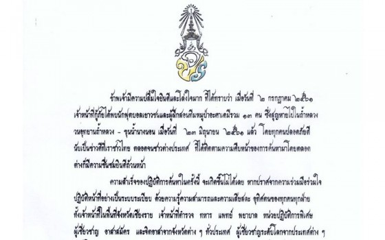 พลโท สรรเสริญ แก้วกำเนิด โฆษกประจำสำนักนายกรัฐมนตรี เปิดเผยว่า พลเอก ประยุทธ์ จันทร์โอชา นายกรัฐมนตรี เปิดเผยว่า สมเด็จพระเจ้าอยู่หัว ทรงมีพระราชกระแสขอบใจ ชื่นชม และให้กำลังใจเจ้าหน้าที่กู้ภัย ที่ได้พบนักฟุตบอลเยาวชนและผู้ฝึกสอนทีมหมูป่าอะคาเดมี รวม 13 คน โดยทุกคนปลอดภัยดี ทรงรับสั่งว่าความสำเร็จของการปฏิบัติในครั้งนี้เกิดจาก ความร่วมมือร่วมใจ ความรู้ความสามารถ และความเสียสละของทุกฝ่าย ทั้งชาวไทย และต่างประเทศ พลโท สรรเสริญ กล่าวต่อว่า นายกรัฐมนตรีได้รับใส่เกล้าใส่กระหม่อมว่า เหตุการณ์ครั้งนี้ แสดงให้เห็นเป็นที่ประจักษ์ว่า ความสมัครสมานสามัคคี และความรักความปรารถนาดี ต่อเพื่อนมนุษย์ เป็นสิ่งที่ทุกคนไม่ว่าจะเชื้อชาติใด ศาสนาใด ต่างมีอยู่ในหัวใจอย่าง เต็มเปี่ยม ซึ่งพระองค์ท่านได้ทรงชื่นชมยกย่อง และขอให้มีกำลังใจในการปฏิบัติหน้าที่ ในขั้นต่อไปให้สำเร็จลุล่วงอย่างดีที่สุด สมดังความหวังตั้งใจของทุกฝ่าย จึงนับเป็น พระมหากรุณาธิคุณอย่างหาที่สุดมิได้