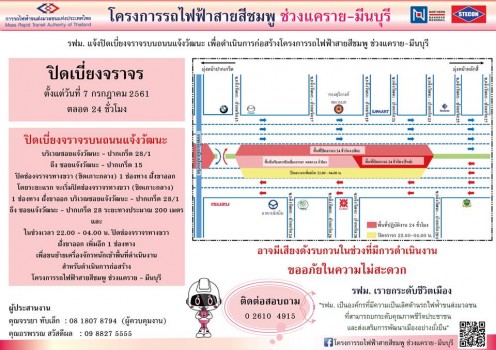 การรถไฟฟ้าขนส่งมวลชนแห่งประเทศไทย หรือ รฟม. แจ้งว่า บริษัท ซิโน-ไทย เอ็นจีเนียริ่ง แอนด์ คอนสตรัคชั่น จำกัด (มหาชน) ผู้รับจ้างก่อสร้างงานโยธา โครงการรถไฟฟ้าสายสีชมพู ช่วงแคราย - มีนบุรี มีความจำเป็นต้องปิดเบี่ยงจราจรบนถนนรัตนาธิเบศร์ บริเวณศูนย์ราชการ จังหวัดนนทบุรี ถึง บริเวณแยกแคราย เพื่อดำเนินการก่อสร้างโครงการฯ ตั้งแต่วันนี้ ( 7 ก.ค.) เป็นต้นไป โดยมีรายละเอียด คือ ปิดการจราจรช่องที่ 2 (นับจากทางเท้า) 1 ช่องจราจร และเกาะสีแบ่งช่องจราจรฝั่งขาเข้า มุ่งหน้าแคราย ตลอด 24 ชม. โดยระยะแรก จะเริ่มปิดการจราจร บริเวณศูนย์ราชการจังหวัดนนทบุรี ถึง ซอยรัตนาธิเบศร์ 4 ระยะทางประมาณ 200 เมตร และ ปิดการจราจรช่องทางที่ 1 (นับจากช่องทางหลัก) ฝั่งขาเข้า เพิ่มอีก 1 ช่องจราจร ในช่วงเวลา 22.00 - 04.00 น. เพื่อขนย้ายเครื่องจักรหนักเข้าพื้นที่ดำเนินงาน ทั้งนี้ การดำเนินงานดังกล่าวอาจส่งผลให้การจราจรชะลอตัว ติดขัด และอาจมีเสียงดังรบกวน โดยระหว่างดำเนินงาน จะมีการติดตั้งป้ายเตือนล่วงหน้าก่อนถึงจุดเบี่ยง ป้ายจราจร กรวยยาง และสัญญาณไฟส่องสว่าง เพื่อความปลอดภัยของผู้ใช้เส้นทาง รฟม. จึงขออภัยในความ ไม่สะดวก สำหรับผู้ที่ต้องการสอบถามรายละเอียดการเบี่ยงจราจรเพิ่มเติม สามารถติดต่อได้ที่ 0 2610 4915 และ 09 8827 5555
