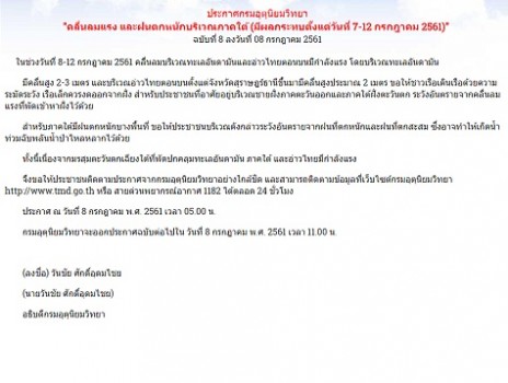 ประกาศกรมอุตุนิยมวิทยา "คลื่นลมแรง และฝนตกหนักบริเวณภาคใต้ (มีผลกระทบตั้งแต่วันที่ 7-12 กรกฎาคม 2561)" ฉบับที่ 8 ช่วงวันที่ 8-12 กรกฎาคม คลื่นลมบริเวณทะเลอันดามันและอ่าวไทยตอนบนกำลังแรง โดยบริเวณทะเลอันดามันคลื่นสูง 2-3 เมตร และบริเวณอ่าวไทยตอนบนตั้งแต่จังหวัดสุราษฎร์ธานีขึ้นมา คลื่นสูงประมาณ 2 เมตร ขอให้ชาวเรือเดินเรือด้วยความระมัดระวัง เรือเล็กควรงดออกจากฝั่ง สำหรับประชาชนที่อาศัยอยู่บริเวณชายฝั่งภาคตะวันออกและภาคใต้ฝั่งตะวันตก ระวังอันตรายจากคลื่นลมแรงที่พัดเข้าหาฝั่งไว้ด้วย โดยภาคใต้มีฝนตกหนักบางพื้นที่ ขอให้ประชาชนบริเวณดังกล่าว ระวังอันตรายจากฝนที่ตกหนักและฝนที่ตกสะสม ซึ่งอาจทำให้เกิดน้ำท่วมฉับพลันน้ำป่าไหลหลากไว้ด้วย เนื่องจากมรสุมตะวันตกเฉียงใต้ที่พัดปกคลุมทะเลอันดามัน ภาคใต้ และอ่าวไทยมีกำลังแรง จึงขอให้ประชาชนติดตามประกาศจากกรมอุตุนิยมวิทยาอย่างใกล้ชิด และสามารถติดตามข้อมูลที่เว็บไซต์กรมอุตุนิยมวิทยา http://www.tmd.go.th หรือ สายด่วนพยากรณ์อากาศ 1182 ได้ตลอด 24 ชั่วโมง พยากรณ์อากาศ 24 ชั่วโมงข้างหน้า ประเทศไทยมีฝนตกต่อเนื่อง กับมีฝนตกหนักบางแห่งบริเวณภาคตะวันออกและภาคใต้ โดยทุกภาคมีฝนฟ้าคะนอง ร้อยละ 40 ของพื้นที่ กรุงเทพมหานครและปริมณฑล ส่วนมากระหว่างบ่ายถึงค่ำ