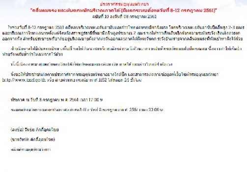 ประกาศกรมอุตุนิยมวิทยา "คลื่นลมแรง และฝนตกหนักบริเวณภาคใต้ (มีผลกระทบตั้งแต่วันที่ 8-12 กรกฎาคม 2561)" ฉบับที่ 10 ช่วงวันที่ 8-12 กรกฎาคม คลื่นลมบริเวณทะเลอันดามันและอ่าวไทยตอนบนมีกำลังแรง โดยบริเวณทะเลอันดามันมีคลื่นสูง 2-3 เมตร และบริเวณอ่าวไทยตอนบนตั้งแต่ จังหวัดสุราษฎร์ธานี ขึ้นมา มีคลื่นสูงประมาณ 2 เมตร ขอให้ชาวเรือเดินเรือด้วยความระมัดระวัง เรือเล็กควรงดออกจากฝั่ง สำหรับประชาชนที่อาศัยอยู่บริเวณชายฝั่งภาคตะวันออกและภาคใต้ฝั่งตะวันตก ระวังอันตรายจากคลื่นลมแรงที่พัดเข้าหาฝั่งไว้ด้วย สำหรับภาคใต้มีฝนตกหนักบางพื้นที่ ขอให้ประชาชนบริเวณดังกล่าวระวังอันตรายจากฝนที่ตกหนักและฝนที่ตกสะสม ซึ่งอาจทำให้เกิดน้ำท่วมฉับพลันน้ำป่าไหลหลากไว้ด้วย เนื่องจากมรสุมตะวันตกเฉียงใต้ที่พัดปกคลุมทะเลอันดามัน ภาคใต้ และอ่าวไทยมีกำลังแรง จึงขอให้ประชาชนติดตามประกาศจากกรมอุตุนิยมวิทยาอย่างใกล้ชิด และสามารถติดตามข้อมูลที่เว็บไซต์กรมอุตุนิยมวิทยา http://www.tmd.go.th หรือ สายด่วนพยากรณ์อากาศ 1182 ได้ตลอด 24 ชั่วโมง