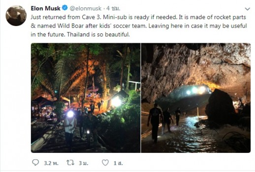 วันนี้ (10 ก.ค.) ทวิตเตอร์ @elonmusk ของ อีลอน มัสก์ มหาเศรษฐีชาวอเมริกัน ผู้ก่อตั้ง บริษัทเทสลา และสเปซเอ็กซ์ ผู้ได้รับฉายาว่า "พ่อมดวงการเทคโนโลยีโลก" ทวีตข้อความ และภาพจำนวน 2 ภาพ ระบุว่า เพิ่งกลับมาจากโถง 3 เรือดำน้ำจิ๋วพร้อมสำหรับการใช้งาน หากมีความต้องการ มันทำจากชิ้นส่วนของจรวด และตั้งชื่อว่าหมูป่า (Wild Boar) ตามทีมฟุตบอลของเด็ก ๆ พร้อมระบุว่า ทิ้งไว้ที่นี่เผื่อว่าจะมีประโยชน์ในอนาคต เมืองไทย ช่างงดงามจริง ๆ