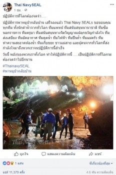 เพจ “Thai Navy SEALs “ โพสต์ข้อความเมื่อเวลา 10.24 น. ระบุว่า “ปฏิบัติการ ที่โลกต้องจดจำ” ปฏิบัติการพาหมูป่ากลับบ้าน เสร็จลงแล้ว Thai Navy SEALs ขอขอบคุณทุกทีม ทั้งนักดำน้ำจากทั่วโลก ทีมแพทย์ ทีมสนับสนุนนานาชาติ ทีมซีลนอกราชการ ทีมครูบา ทีมสนับสนุนทางจิตวิญญาณปลุกขวัญกำลังใจ ทีมส่งเสบียง ทีมอัดอากาศ ทีมดูดน้ำ ทีมไฟฟ้า ทีมปีนถ้ำ ทีมแม่ครัว ทีมทำความ สะอาดห้องน้ำ ทีมเก็บขยะ ชาวแม่สาย และผู้คนจากทั่วโลกที่ส่งกำลังใจมาถึง พวกเราจนปฏิบัติการนี้สำเร็จ วันนี้ พลังของพวกเราทั้งโลก ทำให้ปฏิบัติการนี้ .....เป็นปฏิบัติการที่โลกจะต้อง จดจำไปอีกนาน