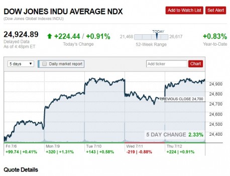 ดัชนีเฉลี่ยอุตสาหกรรมดาวโจนส์ปิดที่ 24,924.89 จุด เพิ่มขึ้น 224.44 จุด หรือ +0.91% ขณะที่ดัชนี S&P 500 ปิดที่ 2,798.29 จุด เพิ่มขึ้น 24.27 จุด หรือ +0.87% และดัชนี Nasdaq ปิดที่ 7,823.92 จุด เพิ่มขึ้น 107.30 จุด หรือ +1.39% ภาวะการซื้อขายในตลาดหุ้นนิวยอร์ก ได้รับปัจจัยหนุนจากการที่นักลงทุนเริ่มคลาย ความกังวลเกี่ยวกับสงครามการค้าระหว่างสหรัฐและจีน เนื่องจากจีนยังไม่ได้ออก มาตรการตอบโต้สหรัฐ แม้คณะทำงานของประธานาธิบดีโดนัลด์ ทรัมป์ ประกาศ เรียกเก็บภาษีนำเข้าสินค้าจากจีนเพิ่มอีก 2 แสนล้านดอลลาร์เมื่อวันพุธที่ผ่านมาก็ตาม นอกจากนี้ เจ้าหน้าที่จีนและสหรัฐ ยังมีแนวโน้มที่จะจัดการเจรจาเพื่อยุติสงครามการค้า ระหว่างกัน โดยนายหวัง ชูเหวิน รัฐมนตรีช่วยว่าการกระทรวงพาณิชย์ของจีน เรียกร้องให้เจ้าหน้าที่สหรัฐ ร่วมแก้ปัญหาความขัดแย้งทางการค้า ผ่านทางการ เจรจาทวิภาคีรอบใหม่ และระบุว่า จีนไม่ต้องการทำสงครามการค้า ขณะที่มีรายงานว่า คณะทำงานของประธานาธิบดีทรัมป์ ก็เต็มใจที่จะหันหน้าเจรจากับจีนเช่นกัน นักลงทุนจับตาการเปิดเผยผลประกอบการของบริษัทจดทะเบียนในสัปดาห์นี้ ซึ่งรวมถึง ธนาคารเวลส์ ฟาร์โก, เจพีมอร์แกน เชส แอนด์ โค และซิตี้กรุ๊ป ขณะที่นักวิเคราะห์คาดว่า ผลประกอบการในไตรมาส 2 ของบริษัทจดทะเบียนในสหรัฐจะเพิ่มขึ้น 20% หลังจาก ที่พุ่งขึ้น 24% ในไตรมาสแรก