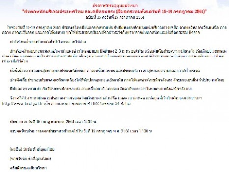 ประกาศกรมอุตุนิยมวิทยา "ฝนตกหนักบริเวณประเทศไทย และคลื่นลมแรง (มีผลกระทบตั้งแต่วันที่ 15-19 กรกฎาคม 2561)" ฉบับที่ 15 ช่วงวันที่ 15-19 กรกฎาคม ประเทศไทยมีฝนตกชุกหนาแน่น กับมีฝนตกหนักบางแห่ง บริเวณภาคเหนือ ภาคตะวันออกเฉียงเหนือ ภาคกลาง ภาคตะวันออก และภาคใต้ตอนบน ขอให้ประชาชนบริเวณดังกล่าวระวังอันตรายจากฝนตกหนักและฝนที่ตกสะสม ซึ่งอาจทำให้เกิดน้ำท่วมฉับพลันน้ำป่าไหลหลากไว้ด้วย สำหรับคลื่นลมบริเวณทะเลอันดามันและอ่าวไทยตอนบน คลื่นสูง 2-3 เมตร ขอให้ชาวเรือเดินเรือด้วยความระมัดระวัง เรือเล็กบริเวณทะเลอันดามันควรงดออกจากฝั่ง สำหรับประชาชนที่อาศัยอยู่บริเวณชายฝั่งภาคตะวันออกและภาคใต้ฝั่งตะวันตก ระวังอันตรายจากคลื่นลมแรงที่พัดเข้าหาฝั่งไว้ด้วย เนื่องจากร่องมรสุมพาดผ่านประเทศเมียนมา ภาคเหนือตอนบน และประเทศลาว เข้าสู่หย่อมความกดอากาศต่ำบริเวณอ่าวตังเกี๋ย ประกอบกับมรสุมตะวันตกเฉียงใต้ที่พัดปกคลุมทะเลอันดามัน ภาคใต้และอ่าวไทยมีกำลังแรง ลักษณะเช่นนี้ทำให้ประเทศไทยมีฝนตกชุกหนาแน่น กับมีฝนตกหนักบางแห่ง ส่วนคลื่นลมบริเวณทะเลอันดามันและอ่าวไทยตอนบนยังคงมีกำลังแรง จึงขอให้ประชาชนติดตามประกาศจากกรมอุตุนิยมวิทยาอย่างใกล้ชิด และสามารถติดตามข้อมูลที่เว็บไซต์กรมอุตุนิยมวิทยา http://www.tmd.go.th หรือ สายด่วนพยากรณ์อากาศ 1182 ได้ตลอด 24 ชั่วโมง