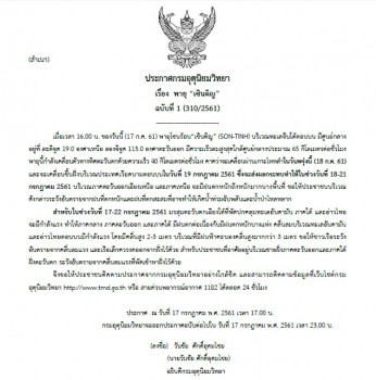 เมื่อเวลา 16.00 น. พายุโซนร้อน“เซินติญ” (SON-TINH) บริเวณทะเลจีนใต้ตอนบน มีความเร็วลมสูงสุดใกล้ศูนย์กลางประมาณ 65 กิโลเมตรต่อชั่วโมง พายุนี้กำลังเคลื่อนตัวทางทิศตะวันตก ด้วยความเร็ว 40 กิโลเมตรต่อชั่วโมง คาดว่าจะเคลื่อนผ่านเกาะไหหลำในวันพรุ่งนี้ (18 ก.ค.) และจะเคลื่อนขึ้นฝั่งบริเวณประเทศเวียดนามตอนบน ในวันที่ 19 กรกฎาคม ซึ่งจะส่งผลกระทบทำให้ช่วงวันที่ 18-21 กรกฎาคม บริเวณภาคตะวันออกเฉียงเหนือและภาคเหนือ จะมีฝนตกหนักถึงหนักมากบางพื้นที่ ขอให้ประชาชนบริเวณดังกล่าว ระวังอันตรายจากฝนที่ตกหนักและฝนที่ตกสะสม ที่อาจทำให้เกิดน้ำท่วมฉับพลันและน้ำป่าไหลหลาก สำหรับช่วงวันที่ 17-22 กรกฎาคม มรสุมตะวันตกเฉียงใต้ ที่พัดปกคลุมทะเลอันดามัน ภาคใต้ และอ่าวไทย จะมีกำลังแรง ทำให้ภาคกลาง ภาคตะวันออก และภาคใต้ มีฝนตกต่อเนื่องกับมีฝนตกหนักบางแห่ง คลื่นลมบริเวณทะเลอันดามันและอ่าวไทยตอนบนมีกำลังแรง โดยคลื่นสูง 2-3 เมตร บริเวณที่มีฝนฟ้าคะนองคลื่นสูงมากกว่า 3 เมตร ขอให้ชาวเรือระวังอันตรายจากคลื่นลมแรง และเรือเล็กควรงดออกจากฝั่งไว้ด้วย สำหรับประชาชนที่อาศัยอยู่บริเวณชายฝั่งภาคตะวันออกและภาคใต้ฝั่งตะวันตก ระวังอันตรายจากคลื่นลมแรงที่พัดเข้าหาฝั่งไว้ด้วย ขอให้ประชาชนติดตามประกาศจากกรมอุตุนิยมวิทยาอย่างใกล้ชิด และสามารถติดตามข้อมูลที่เว็บไซต์กรมอุตุนิยมวิทยา www.tmd.go.th หรือ สายด่วนพยากรณ์อากาศ 1182 ได้ตลอด 24 ชั่วโมง