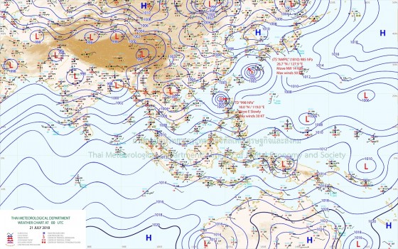 ประกาศกรมอุตุนิยมวิทยา "พายุดีเปรสชันบริเวณทะเลจีนใต้ตอนบน" ฉบับที่ 1 ลงวันที่ 21 กรกฎาคม 2561 เมื่อเวลา 10.00 น. ของวันนี้ (21 ก.ค. 61) หย่อมความกดอากาศต่ำกำลังแรงบริเวณ ทะเลจีนใต้ตอนบน ได้ทวีกำลังแรงขึ้นเป็นพายุดีเปรสชันแล้ว โดยมีศูนย์กลาง อยู่ที่ละติจูด 18.0 องศาเหนือ ลองจิจูด 119.5 องศาตะวันออก มีความเร็วลมสูงสุด ใกล้ศูนย์กลางประมาณ 55 กิโลเมตรต่อชั่วโมง พายุนี้กำลังเคลื่อนตัวไปทาง ทิศตะวันออกอย่างช้า ๆ ขอให้ผู้ที่จะเดินทางผ่านบริเวณดังกล่าวตรวจสอบสภาพ อากาศก่อนออกเดินทาง โดยพายุนี้ยังไม่มีผลกระทบโดยตรงต่อลักษณะอากาศ ของประเทศไทย สำหรับมรสุมตะวันตกเฉียงใต้ที่พัดปกคลุมทะเลอันดามัน ภาคใต้ และอ่าวไทย ยังคงมีกำลังแรง ทำให้ภาคตะวันออกมีฝนตกหนักบางแห่ง ส่วนคลื่นลมบริเวณ ทะเลอันดามันและอ่าวไทยตอนบนมีกำลังแรง โดยมีคลื่นสูง 2-3 เมตร บริเวณ ที่มีฝนฟ้าคะนองคลื่นสูงมากกว่า 3 เมตร ขอให้ชาวเรือระวังอันตรายจากคลื่นลมแรง เรือเล็กควรงดออกจากฝั่งไว้ด้วย และประชาชนที่อาศัยอยู่บริเวณชายฝั่งภาคตะวันออก และภาคใต้ฝั่งตะวันตก ระวังอันตรายจากคลื่นลมแรงที่พัดเข้าหาฝั่งจนถึงวันที่ 22 กรกฎาคม 2561 จึงขอให้ประชาชนติดตามประกาศจากกรมอุตุนิยมวิทยาอย่างใกล้ชิด และติดตาม ข้อมูลที่เว็บไซต์กรมอุตุนิยมวิทยา http://www.tmd.go.th หรือ สายด่วนพยากรณ์อากาศ 1182 ได้ตลอด 24 ชั่วโมง