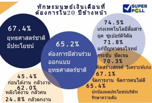 นายนพดล กรรณิกา ผู้อำนวยการสำนักวิจัยซูเปอร์โพล เปิดเผยผลสำรวจความคิดเห็น ประชาชนเรื่อง “ผู้บริหารองค์กร คิดอย่างไรต่องานและทักษะของคนไทยในอนาคต 20 ปีข้างหน้า” สอบถาม 1,098 ตัวอย่าง ระหว่างวันที่ 1-19 ก.ค. ที่ผ่านมา พบว่า ประชาชนร้อยละ 67.40 ระบุว่า ยุทธศาสตร์ชาติ 20 ปีมีประโยชน์ ในขณะที่ร้อยละ 23.10 ระบุว่า ไม่มีประโยชน์ และร้อยละ 9.50 ไม่มีความเห็น เมื่อถามถึง ความต้องการมีส่วนร่วมออกแบบยุทธศาสตร์ชาติ 20 ปี พบว่าประชาชน ส่วนใหญ่ร้อยละ 65.20 ระบุว่า ต้องการมีส่วนร่วมออกแบบยุทธศาสตร์ชาติ 20 ปี ขณะที่ร้อยละ 34.80 ระบุว่า ไม่ต้องการ ส่วนเกณฑ์รับคนเข้าทำงานในอีก 20 ปีข้างหน้า พบว่า ประชาชนส่วนใหญ่ร้อยละ 74.50 ระบุว่า เก่งเทคโนโลยีสื่อสาร ยุคซูเปอร์ดิจิทัล รองลงมาร้อยละ 71.80 ระบุว่าแก้ปัญหา ได้ตรงโจทย์ กระชับและชัดเจน, ร้อยละ 70.30 ระบุว่า คิดสร้างสรรค์วิเคราะห์เก่ง, ร้อยละ 67.10 ระบุว่า จัดการงานและจัดการคนได้ดี และร้อยละ 65.40 ระบุว่า ปกป้อง ประโยชน์บริษัท รักษาความลับ เมื่อถามถึง ความกลัวของมุนษย์เงินเดือน พบว่าประชาชนส่วนใหญ่ร้อยละ 45.40 ระบุว่า ก่อนได้งาน กลัวงาน ขณะที่ร้อยละ 62.00 ระบุว่า หลังงาน กลัวคน และ ร้อยละ24.80 ระบุว่า กลัวตกงาน