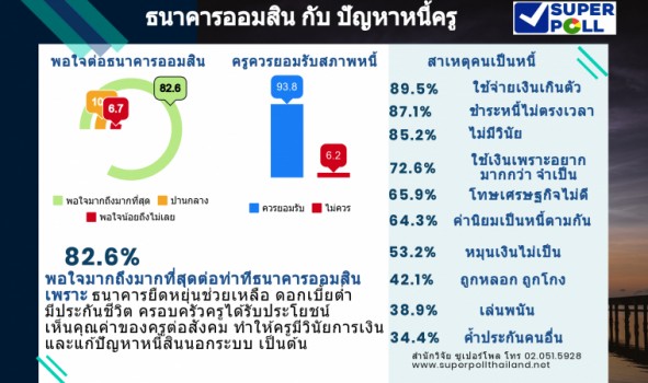 นายนพดล กรรณิกา ผู้อำนวยการ สำนักวิจัยซูเปอร์โพล มูลนิธิสถาบันวิจัยความสุขชุมชนและความเป็นผู้นำ เปิดเผยผลสำรวจ เรื่อง ประชาชนคิดอย่างไรต่อธนาคารออมสิน กับปัญหาหนี้ครู กรณีศึกษาตัวอย่างประชาชนทุกสาขาอาชีพ 1,156 ตัวอย่าง ดำเนินโครงการระหว่าง วันที่ 19-21 กรกฎาคม พบว่า ส่วนใหญ่หรือร้อยละ 94.3 ทราบข่าว ธนาคารออมสิน กับ กลุ่มครูเรียกร้องเรื่องหนี้สิน ที่เหลือ ร้อยละ 5.7 ไม่ทราบข่าว โดยส่วนใหญ่หรือร้อยละ 76.6 ไม่เห็นด้วยต่อการประกาศไม่ยอมชำระหนี้ของครู เพราะธนาคารทำถูกแล้ว ครูต้องเป็นตัวอย่างที่ดีต่อสังคม ครูต้องมีวินัย ใช้ชีวิตพอเพียง ยอมรับผลที่ตัวเองทำ และไม่ควรใช้กฎหมู่มาทำให้เสียภาพลักษณ์ เป็นต้น ร้อยละ 14.7 ไม่ค่อยเห็นด้วย ขณะที่ร้อยละ 6.4 ค่อนข้างเห็นด้วย มีเพียงร้อยละ 2.3 เท่านั้นที่เห็นด้วย เพราะปัญหาค่าครองชีพสูง หนี้สินครูมีมาก ทำประโยชน์ให้กับสังคม น่าเห็นใจ เงินเดือนน้อย เป็นต้น ส่วนใหญ่หรือร้อยละ 93.8 ระบุ ครูควรยอมรับสภาพหนี้ที่ครูก่อไว้กับธนาคาร ที่เหลือเพียงร้อยละ 6.2 ระบุไม่ควรยอมรับ ที่น่าพิจารณา คือ ส่วนใหญ่หรือร้อยละ 82.6 พอใจมากถึงมากที่สุด ต่อท่าทีของธนาคารออมสิน กรณีแก้ปัญหาหนี้ครู เพราะธนาคารยืดหยุ่นช่วยเหลือมากแล้ว ดอกเบี้ยต่ำ มีประกันชีวิต ครอบครัวครูได้รับผลประโยชน์ เห็นคุณค่าของครูทำประโยชน์สังคม ทำให้ครูมีวินัยการเงิน และแก้ปัญหาหนี้สินนอกระบบ ร้อยละ 10.7 พอใจปานกลาง มีเพียงร้อยละ 6.7 ที่พอใจน้อยถึงไม่พอใจเลย เพราะปัญหาค่าครองชีพสูงยังแก้ปัญหาไม่ถูกจุด ควรให้กู้เพิ่ม ที่น่าสนใจ คือ สาเหตุหลักของปัญหาหนี้สินของประชาชนทั่วไป พบว่า ส่วนใหญ่หรือร้อยละ 89.5 ระบุ ใช้จ่ายเงินเกินตัว รองลงมา ร้อยละ 87.1 ชำระหนี้ไม่ตรงเวลา ร้อยละ 85.2 ไม่มีวินัย ร้อยละ 72.6 ใช้เงินเพราะ”อยาก” มากกว่า”จำเป็น” ร้อยละ 65.9 โทษเศรษฐกิจไม่ดี ตามด้วย มีค่านิยมเป็นหนี้ตาม ๆ กัน หมุนเงินไม่เป็น ถูกหลอกถูกโกง เล่นพนัน และ ค้ำประกันคนอื่น ตามลำดับ