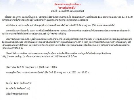 พยากรณ์อากาศ 24 ชั่วโมงข้างหน้า บริเวณภาคเหนือและภาคตะวันออกเฉียงเหนือ มีฝนมากกว่าบริเวณอื่น ๆ และมีฝนตกหนักบางแห่ง โดยมีฝนฟ้าคะนอง ร้อยละ 70 ของพื้นที่ และมีฝนตกหนักบางแห่ง ขอให้ระวังผลกระทบจากฝนตกหนักและฝนตกสะสม ที่ทำให้เกิดน้ำท่วมฉับพลันและน้ำป่าไหลหลากไว้ด้วย สำหรับภาคกลาง ภาคใต้ รวมทั้งกรุงเทพมหานครและปริมณฑล ยังคงมีฝนฟ้าคะนองในระยะนี้ โดยภาคกลาง ภาคตะวันออก กรุงเทพมหานครและปริมณฑล มีฝนฟ้าคะนอง ร้อยละ 40 ของพื้นที่ ขณะที่ภาคใต้ ฝนฟ้าคะนอง ร้อยละ 30 ของพื้นที่ สำหรับคลื่นลมบริเวณทะเลอันดามันตอนบน คลื่นสูง 2-3 เมตร บริเวณที่มีฝนฟ้าคะนองคลื่นสูงมากกว่า 3 เมตร และอ่าวไทยตอนบนคลื่นสูงประมาณ 2 เมตร ขอให้เดินเรือด้วยความระมัดระวัง เรือเล็กบริเวณทะเลอันดามันตอนบนควรงดออกจากฝั่งต่อไปอีก 1 วัน ส่วนประชาชนที่อาศัยอยู่บริเวณชายฝั่งภาคตะวันออกและภาคใต้ฝั่งตะวันตก ระวังอันตรายจากคลื่นลมแรงที่พัดเข้าหาฝั่งไว้ด้วย ทั้งนี้ พายุโซนร้อน “อ๊อมปึล” บริเวณชายฝั่งประเทศจีนตอนบน คาดว่าจะเคลื่อนขึ้นฝั่งบริเวณนครเซียงไฮ้ ประเทศจีน ในคืนนี้ (22 ก.ค.) พายุนี้ไม่มีผลกระทบโดยตรงต่อประเทศไทย แต่สำหรับผู้ที่จะเดินทางผ่านบริเวณดังกล่าว ควรตรวจสอบสภาพอากาศก่อนออกเดินทาง