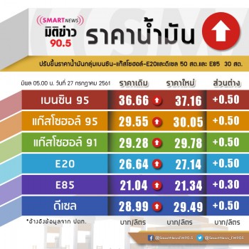 บริษัท ปตท.น้ำมันและการค้าปลีก จำกัด หรือ PTTOR และบริษัท บางจาก คอร์ปอเรชั่น จำกัด (มหาชน) แจ้งปรับขึ้นราคาขายปลีกน้ำมันทุกชนิด 50 สตางค์ต่อลิตร ยกเว้น E85 ปรับขึ้น 30 สตางค์ต่อลิตร พรุ่งนี้ (27 ก.ค.) เวลา 05.00 น. จะส่งผลให้ราคาขายปลีกหน้าสถานีบริการน้ำมัน จะเป็นดังนี้ - น้ำมันเบนซิน ราคา 37.16 บาท/ลิตร - แก๊สโซฮอล์ 95 ราคา 30.05 บาท/ลิตร - แก๊สโซฮอล์ 91 ราคา 29.78 บาท/ลิตร - E20 ราคา 27.14 บาท/ลิตร - E85 ราคา 21.34 บาท/ลิตร - ดีเซล ราคา 29.49 บาท/ลิตร - ดีเซลพรีเมียม ราคา 32.49 บาท/ลิตร ราคาขายปลีกดังกล่าว ยังไม่รวมภาษีบำรุงท้องถิ่น