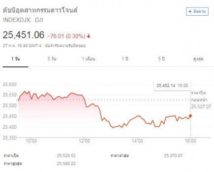ดัชนีเฉลี่ยอุตสาหกรรมดาวโจนส์ ปรับตัวลง 76.01 จุด หรือ 0.30% ปิดที่ 25,451.06 จุด ดัชนี S&P 500 ลดลง 18.62 จุด หรือ 0.66% ปิดที่ 2,818.82 จุด ดัชนี Nasdaq ร่วงลง 114.77 จุด หรือ 1.46% ปิดที่ 7,737.42 จุด ดัชนีดาวโจนส์ตลาดหุ้นนิวยอร์ก ปิดปรับตัวลงเมื่อคืนนี้ (27 ก.ค.) เนื่องจากการร่วงลงของหุ้นกลุ่มเทคโนโลยีได้เข้ามาบดบังปัจจัยบวกจากตัวเลข GDP ที่ขยายตัวแข็งแกร่ง หุ้นกลุ่มเทคโนโลยีปรับตัวลงอย่างต่อเนื่อง โดยได้รับแรงกดดันจากหุ้นเฟซบุ๊กที่ร่วงลงอย่างหนักเป็นประวัติการณ์เมื่อวันพฤหัสบดี หลังจากเฟซบุ๊กได้ปรับลดคาดการณ์ธุรกิจตลอดทั้งปี ขณะที่ตัวเลขคาดการณ์รายได้ของบริษัทก็ออกมาต่ำกว่าคาดการณ์ และการขยายตัวของกลุ่มผู้ใช้งานก็ชะลอตัวลง หุ้นทวิตเตอร์ดิ่ง 20.54% เมื่อวานนี้ หลังบริษัทรายงานว่ายอดผู้ใช้งานประจำรายเดือนลดลง 1 ล้านคนในไตรมาสสองของปีนี้ เมื่อเทียบกับไตรมาสแรก และยังคาดการณ์ว่าตัวเลขดังกล่าวอาจปรับตัวลงอีก หุ้นอินเทล ร่วงลง 8.59% หลังบริษัทเลื่อนการเปิดตัวชิปรุ่นใหม่ออกไป แม้ว่าบริษัทจะเปิดเผยผลประกอบการรายไตรมาสที่ดีกว่าคาดการณ์ก็ตาม