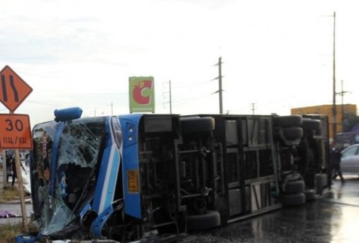 กรณีเมื่อช่วงเช้า เกิดอุบัติเหตุรถทัวร์โดยสาร เส้นทางกรุงเทพฯ-ปากพนัง พลิกคว่ำบนถนนเลี่ยงเมือง ต.บางกุ้ง อ.เมืองสุราษฎร์ธานี ทำให้มีผู้โดยสารบาดเจ็บ 27 คน กู้ภัยเร่งนำผู้บาดเจ็บเข้าห้องฉุกเฉิน โรงพยาบาลสุราษฎร์ธานี ตำรวจควบคุมตัวคนขับรถ คือ นายสมบัติ ดวงมาตร ไปสอบสวนดำเนินคดี รถโดยสารคันดังกล่าว เดินทางออกจากกรุงเทพมหานคร เมื่อคืนเวลาประมาณ 20.00 น. โดยมีผู้โดยสารและพนักงาน มากับรถ 45 คน และจอดส่งผู้โดยสารที่สถานีขนส่งสุราษฎร์ธานี แต่เมื่อถึงที่เกิดเหตุ พื้นถนนลื่นเนื่องจากฝนตก และยังมีการก่อสร้างผิวการจราจร ทำให้รถเสียหลักจนพลิกตะแคง สำหรับผู้โดยสารที่บาดเจ็บ 27 คนนั้น เป็นชาย12 คน หญิง 15 คน บาดเจ็บเล็กน้อย ไม่ประสงค์ไปโรงพยาบาล 8 คน เป็นชาย 7 คน หญิง 1 คน บริษัท นครศรีร่มเย็นทัวร์ จำกัด เจ้าของรถโดยสารคันเกิดเหตุ จัดรถส่งผู้โดยสารที่บาดเจ็บเล็กน้อยกลับภูมิลำเนา และดูแลอาการบาดเจ็บของผู้โดยสารที่ยังต้องรักษาตัวที่โรงพยาบาล
