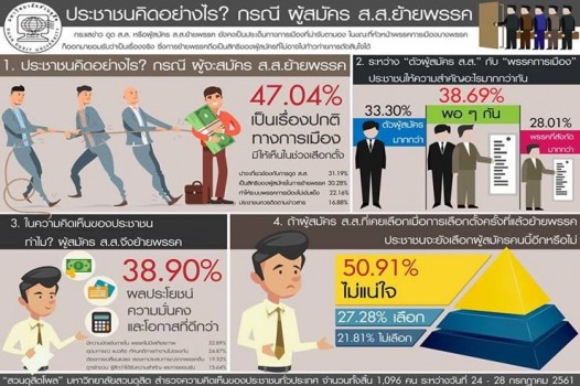สวนดุสิตโพล มหาวิทยาลัยสวนดุสิต สำรวจความคิดเห็นประชาชนทั่วประเทศ จำนวน 1,096 คน ระหว่างวันที่ 24-28 กรกฎาคม 2561 จากกรณีข่าวดูด ส.ส. หรือผู้สมัคร ส.ส. ย้ายพรรค พบว่า ประชาชนร้อยละ 50.91 ยังไม่แน่ใจว่าหากผู้สมัคร ส.ส.ที่เคยเลือก เมื่อมีการย้ายพรรคจะยังเลือกผู้สมัครคนนี้อีกหรือไม่ เพราะต้องรอดูก่อนว่าย้ายไปพรรคไหน ใครเป็นหัวหน้าพรรค นโยบาย และพิจารณาจากหลายปัจจัยเป็นหลัก ,ร้อยละ 38.90 มองว่า เหตุผลที่ผู้สมัคร ส.ส. ย้ายพรรค เป็นเรื่องผลประโยชน์ ความมั่นคง และโอกาส ที่ดีกว่า,ร้อยละ 32.89 มีความขัดแย้งภายใน พรรคไม่มีเสถียรภาพ นอกจากนี้ ประชาชนร้อยละ 47.04 มองว่า กรณีผู้สมัคร ส.ส.ย้ายพรรค เป็นเรื่องปกติ ทางการเมือง มีให้เห็นช่วงเลือกตั้ง ,ร้อยละ 31.19 เป็นเรื่องที่ถูกจับตามอง น่าจะเกี่ยวข้อง กับการดูด ส.ส. และร้อยละ 30.28 เป็นสิทธิของผู้สมัครที่มีอิสระในการย้ายพรรค