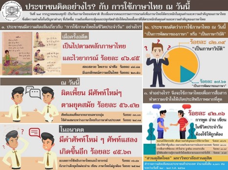 เนื่องในวันภาษาไทยแห่งชาติ 29 กรกฎาคม "สวนดุสิตโพล” มหาวิทยาลัยสวนดุสิต สำรวจความคิดเห็นของประชาชนทั่วประเทศ จำนวน 1,140 คน ระหว่างวันที่ 24-27 กรกฎาคม 2561 สรุปผลได้ ดังนี้ ประชาชนมีความคิดเห็นเกี่ยวกับ “การใช้ภาษาไทยในชีวิตประจำวัน” อย่างไร “การใช้ภาษาไทยในชีวิตประจำวัน” เมื่อครั้งอดีต 1. การพูด การอ่าน การเขียน เป็นไปตามหลักภาษาไทยและไวยากรณ์ 46.45% 2. เป็นภาษาที่สละสลวย ไพเราะ น่าฟัง 44.81% 3. เป็นภาษาถิ่น เข้าใจง่าย มีเอกลักษณ์ความเป็นไทย 23.50% “การใช้ภาษาไทยในชีวิตประจำวัน” วันนี้ 1. การพูด การอ่าน การเขียน ผิดเพี้ยน มีศัพท์ใหม่ๆ ตามยุคสมัย 56.42% 2. มีคำฮิต คิดคำใหม่ๆ ศัพท์แสลงที่หลากหลายเฉพาะกลุ่ม 33.03% 3. มีการใช้คำผสมระหว่างภาษาไทยกับภาษาต่างประเทศ 24.31% “การใช้ภาษาไทยในชีวิตประจำวัน” ในอนาคตข้างหน้า 1. มีคำศัพท์ใหม่ๆ ศัพท์แสลงเกิดขึ้นอีก คำอาจสั้นกว่าเดิม 45.63% 2. เน้นความสะดวกในการสื่อสาร ละเลยการใช้หลักภาษาไทยและไวยากรณ์ 36.41% 3. กังวลว่าเด็กยุคใหม่จะอ่าน เขียน ภาษาไทยไม่ถูกต้อง 25.24% ประชาชนคิดว่าการใช้ภาษาไทย วันนี้ “เป็นการพัฒนาของภาษา”หรือ“เป็นภาษาวิบัติ” 1. “เป็นภาษาวิบัติ” 82.39% เพราะใช้คำผิดแปลกไป ทั้งการพูด อ่าน เขียน มีการ สร้างคำใหม่เพื่อใช้พูดคุยเพื่อความสนุกสนานเท่านั้น พูดไม่เพราะใช้คำไม่สุภาพ ไม่ถูกกาละเทศะ 2. “เป็นการพัฒนาของภาษา” 17.61% เพราะ มีการเปลี่ยนแปลงประโยคหรือคำพูด เพื่อความทันสมัย ทันเหตุการณ์ มีศัพท์ใหม่ๆ ที่สื่อสารเข้าใจง่าย เข้ากับยุคสมัย และเป็นศัพท์ที่นิยมใช้ในกลุ่มคนรุ่นใหม่ ฯลฯ ทำอย่างไร? จึงจะใช้ภาษาไทยเพื่อการสื่อสารทำความเข้าใจให้เกิดประสิทธิภาพมากที่สุด 1. การพูด อ่าน เขียน ในชีวิตประจำวันต้องใช้ให้ถูกต้อง 42.36% 2. กระตุ้น รณรงค์ให้ทุกคนตระหนัก เห็นความสำคัญของการใช้ภาษาไทย 35.96% 3. เลือกใช้คำที่ถูกต้อง เหมาะสมกับสถานการณ์และกาละเทศะ 13.30% 4. การสื่อสารที่ชัดเจน เข้าใจง่าย ถูกต้อง ตรงประเด็น 10.34% 5. ผู้ใช้ต้องมีความรู้ความเข้าใจในหลักภาษาและการนำไปใช้ 9.85%