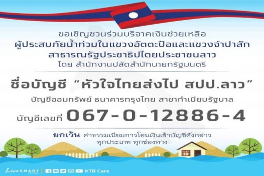 นายสมพาศ นิลพันธ์ รองปลัดสำนักนายกรัฐมนตรี เปิดเผยว่า ทำเนียบรัฐบาล โดยสำนักงาน ปลัดสำนักนายกรัฐมนตรี เชิญชวนประชาชนร่วมบริจาคเงินช่วยเหลือผู้ประสบภัยน้ำท่วม ในแขวงอัตตะปือและแขวงจำปาสัก สาธารณรัฐประชาธิปไตยประชาชนลาว หรื อสปป.ลาว ผ่านบัญชี "หัวใจไทยส่งไป สปป.ลาว" บัญชีออมทรัพย์ ธนาคารกรุงไทย สาขาทำเนียบรัฐบาล บัญชีหมายเลข 067 0 12886 4 โดยยอดบริจาคล่าสุดจนถึงช่วง 10.00 น.วันนี้ จำนวนเงิน มากกว่า 32 ล้านบาทแล้ว ทั้งนี้ รัฐบาลขอเชิญชวนประชาชนร่วมบริจาคสิ่งของ เสื้อผ้า และอาหารแห้ง ได้ทุกวัน ตั้งแต่ 08.30-16.00 น.ไม่เว้นวันหยุดราชการ โดยขอให้เป็นเสื้อผ้าใหม่ ส่วนอาหารแห้ง ต้องไม่หมดอายุ ซึ่งรัฐบาลยังไม่มีกำหนดปิดรับบริจาค เนื่องจากยังคงต้องการ เครื่องอุปโภคบริโภคอีกเป็นจำนวนมาก