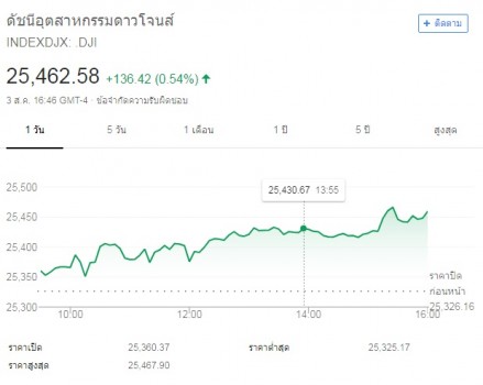 ดัชนีเฉลี่ยอุตสาหกรรมดาวโจนส์ปิดที่ 25,462.58 จุด เพิ่มขึ้น 136.42 จุด หรือ +0.54% ดัชนี S&P 500 ปิดที่ 2,840.35 จุด เพิ่มขึ้น 13.13 จุด หรือ +0.46% ดัชนี Nasdaq ปิดที่ 7,812.01 จุด เพิ่มขึ้น 9.33 จุด หรือ +0.12% ดัชนีดาวโจนส์ตลาดหุ้นนิวยอร์ก ปิดตลาดในแดนบวกเมื่อคืนนี้ (3 ส.ค.) โดยได้รับ ปัจจัยหนุนจากผลประกอบการอันแข็งแกร่งของบริษัทต่าง ๆ ที่มีการรายงานตลอดทั้ง สัปดาห์ อย่างไรก็ตาม ตลาดหุ้นนิวยอร์กปรับตัวขึ้นไม่มากนัก เพราะตลาดยังคงถูกกดดัน จากความกังวลเกี่ยวกับการทำสงครามการค้าระหว่างสหรัฐและจีน นอกจากนี้ การเปิดเผยตัวเลขจ้างงานของสหรัฐที่ต่ำกว่าคาด ก็เป็นปัจจัยจำกัดช่วงบวก ในตลาด อย่างไรก็ตาม นักวิเคราะห์มองว่า ตัวเลขการจ้างงานดังกล่าวบ่งชี้ว่า เศรษฐกิจสหรัฐยังคงเดินหน้าต่อไปได้ในช่วงนี้