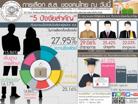 หลังจากประเทศไทยว่างเว้นจากการเลือกตั้งมานานเกือบ 5 ปี ทำให้กระแสข่าวการเลือกตั้งที่คาดว่าจะเกิดขึ้นในปี 2562 เป็นเรื่องสำคัญที่ถูกจับตามอง หลายฝ่ายมีการเตรียมพร้อมเพื่อเข้าสู่การเลือกตั้งที่จะเกิดขึ้น เพื่อสะท้อนความคิดเห็นของผู้มีสิทธิเลือกตั้ง และศึกษาปัจจัยสำคัญต่อการตัดสินใจเลือกผู้สมัคร ส.ส. สวนดุสิตโพล มหาวิทยาลัยสวนดุสิต สำรวจความคิดเห็นของประชาชนทั่วประเทศ จำนวน 1,034 คน ระหว่างวันที่ 8-11 ส.ค. สรุปได้ ดังนี้ “5 ปัจจัยสำคัญ” ที่ประชาชนใช้ตัดสินใจเลือกผู้สมัคร ส.ส. ในการเลือกตั้งครั้งต่อไป อันดับ 1 ความซื่อสัตย์ 27.95% ประเด็นที่อยากรู้ เช่น เรื่องการคดโกง, การได้รับโทษ, การรับสินบน, การซื้อเสียง อันดับ 2 ความรู้ความสามารถ 25.16% ประเด็นที่อยากรู้ เช่น วิสัยทัศน์, ผลงาน, การทำงานที่เป็นที่ยอมรับ, การแก้ปัญหา, การกำหนดนโยบาย อันดับ 3 ประวัติส่วนตัว 16.17% ประเด็นที่อยากรู้ เช่น ชีวิตครอบครัว พ่อแม่/ต้นตระกูล, ชีวิตสมรส ภรรยา บุตร, อายุ อันดับ 4 พื้นฐานการศึกษา 15.86% ประเด็นที่อยากรู้ เช่น ประวัติการศึกษา/ผลการเรียน, จบที่ไหน/ระดับใด, รางวัลที่เคยได้รับ อันดับ 5 ประสบการณ์ทางการเมือง 14.86% ประเด็นที่อยากรู้ เช่น ทำงานการเมืองมากี่ปี, เป็น ส.ส.มาแล้วกี่สมัย, เคยโดนกลั่นแกล้งหรือไม่ ประชาชนอยากได้ผู้สมัคร ส.ส. ที่มาจากอาชีพอะไรมากที่สุด อันดับ 1 ข้าราชการ 29.06% อันดับ 2 นักธุรกิจ 25.42% อันดับ 3 นักกฎหมาย 22.03% อันดับ 4 นักวิชาการ 15.98% อันดับ 5 ทหาร 7.51% ประชาชนอยากได้ผู้สมัคร ส.ส.ที่จบการศึกษาทางด้านใดมากที่สุด อันดับ 1 เศรษฐศาสตร์ 41.22% อันดับ 2 รัฐศาสตร์ 22.01% อันดับ 3 บริหารธุรกิจ 14.75% อันดับ 4 กฎหมาย 14.53% อันดับ 5 รัฐประศาสนศาสตร์ 7.49%