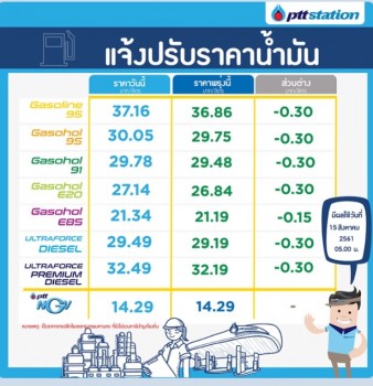 บริษัท ปตท.น้ำมันและการค้าปลีก จำกัด (มหาชน) และบริษัท บางจาก คอร์ปอเรชั่น จำกัด (มหาชน) ประกาศปรับลดราคาน้ำมันทุกชนิด 30 สตางค์ต่อลิตร ยกเว้น E85 ลดลง 15 สตางค์ต่อลิตร มีผลพรุ่งนี้ เวลา 05.00 น. โดยส่งผลให้ราคาใหม่เป็นดังนี้ ดีเซล อยู่ที่ 29.19 บาทต่อลิตร E85 อยู่ที่ 21.19 บาทต่อลิตร E20 อยู่ที่ 26.84 บาทต่อลิตร แก๊สโซฮอล์ 91 อยู่ที่ 29.48 บาทต่อลิตร แก๊สโซฮอล์ 95 อยู่ที่ 29.75 บาทต่อลิตร