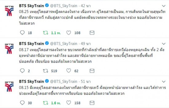 เมื่อเวลา 08.15 น. เกิดเหตุผู้โดยสารหญิง ตกลงไปในรางรถไฟฟ้าบีทีเอส ที่สถานีราชเทวี ฝั่งมุ่งหน้าปลายทางสำโรง เจ้าหน้าที่เข้าช่วยเหลือผู้โดยสารขึ้นจากรางได้เรียบร้อยและปลอดภัย ขณะที่สถานีราชเทวีต้องหยุดฉุกเฉิน ทั้งฝั่งที่มุ่งหน้าสถานีปลายทางสำโรง และสถานีปลายทางหมอชิต ต่อมา รถไฟฟ้าบีทีเอส แจ้งว่า ผู้โดยสารหญิงที่ตกราง เนื่องจากเป็นลม หลังช่วยเหลือเสร็จสิ้น การเดินรถในสายสุขุมวิท ที่สถานีราชเทวี กลับสู่ภาวะปกติ แต่ยังคงมีขบวนรถห่างระยะในบางช่วง