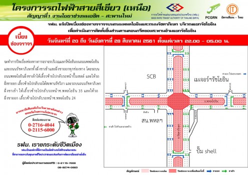 การรถไฟฟ้าขนส่งมวลชนแห่งประเทศไทย หรือ รฟม.แจ้งว่า บริษัท อิตาเลียนไทย ดีเวล๊อปเมนต์ จำกัด (มหาชน) ผู้รับจ้างก่อสร้างงานโยธา โครงการรถไฟฟ้าสายสีเขียว (เหนือ) ช่วงหมอชิต-สะพานใหม่-คูคต สัญญาที่ 1 จะดำเนินการติดตั้งชิ้นส่วนคานคอนกรีต ของสะพานข้ามแยกรัชโยธิน บริเวณแยกรัชโยธิน จึงมีความจำเป็นต้องปิดเบี่ยงช่องทาง การจราจรบนถนนพหลโยธิน และถนนรัชดาภิเษก ทั้งฝั่งขาเข้าและฝั่งขาออกทุกช่องทาง โดยรถบนถนนพหลโยธินฝั่งขาเข้า ให้เลี้ยวซ้ายไปกลับรถหน้าปั๊มเชลล์ และให้รถฝั่งขาออก เลี้ยวซ้ายไปกลับรถใต้สะพานรัชวิภา และรถบนถนนรัชดาภิเษกฝั่งขาเข้าให้เลี้ยวซ้าย ไปกลับรถหน้าซอยพหลโยธิน 35 และให้รถฝั่งขาออกเลี้ยวซ้ายไปกลับรถหน้าซอย พหลโยธิน 24 ในวันจันทร์ที่ 20 สิงหาคม 2561 ถึง วันอังคารที่ 28 สิงหาคม 2561 ตั้งแต่เวลา 22.00-05.00 น. ทั้งนี้ การเบี่ยงจราจรเพื่อดำเนินการก่อสร้างอาจทำให้ผู้ใช้เส้นทางไม่ได้รับความสะดวก ในการเดินทาง และอาจมีเสียงดังรบกวนในวันเวลาดังกล่าว ดังนั้น หากไม่มีความจำเป็น โปรดหลีกเลี่ยงเส้นทางดังกล่าว และ รฟม. ต้องขออภัยมา ณ โอกาสนี้ด้วย