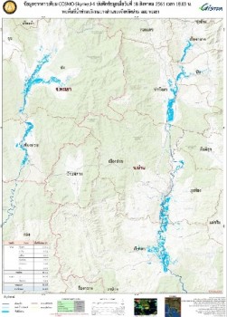 สำนักงานพัฒนาเทคโนโลยีอวกาศและภูมิสารสนเทศ (องค์การมหาชน) หรือ จิสด้า กระทรวงวิทยาศาสตร์และเทคโนโลยี เปิดเผยข้อมูลภาพถ่ายจากดาวเทียม Cosmo-Skymed- 4 ของวันที่ 18 สิงหาคม เวลา 18.03 น. พบพื้นที่น้ำท่วมขังในบางอำเภอของจังหวัดน่าน ได้แก่ เวียงสา ท่าวังผา ภูเวียง ปัว เมืองน่าน เชียงกลาง และจังหวัดพะเยา ได้แก่ เชียงม่วน และปง (พื้นที่สีฟ้า) ซึ่งได้รับผลกระทบจากอิทธิพลของพายุโซนร้อนเบบินคา ส่งผลให้จังหวัดน่านเกือบทุกพื้นที่ มีฝนตกหนักต่อเนื่องตลอดทั้งคืน ทำให้เกิดน้ำล้นตลิ่งในพื้นที่บางส่วน ซึ่งสถานการณ์น้ำท่วมในพื้นที่จังหวัดน่าน ยังมีฝนตกอย่างต่อเนื่อง โดยระดับน้ำลำน้ำสาขาต่าง ๆ และแม่น้ำน่านเพิ่มระดับสูงขึ้นเรื่อย ๆ ทั้งนี้ จิสด้าได้ดำเนินการวางแผนรับสัญญาณดาวเทียม เพื่อติดตามและวิเคราะห์สถานการณ์ในพื้นที่เฝ้าระวังข้างต้นอย่างใกล้ชิด พร้อมส่งต่อข้อมูลที่เกี่ยวข้องให้แก่หน่วยงานหลักและหน่วยงานในพื้นที่ ได้ใช้ประโยชน์ในการบริหารจัดการน้ำ ได้อย่างมีประสิทธิภาพต่อไป