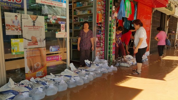 เทศบาลเมืองน่าน เร่งเดินเครื่องสูบน้ำ และยังมีเครื่องสูบน้ำระยะไกลจาก ป้องกันและบรรเทาสาธารณภัย เขต 15 จ.เชียงราย มาช่วยเหลือ เพื่อไม่ให้ย่านเศรษฐกิจเมืองน่านได้รับความเสียหายมาก หลังทุกฝ่าย รวมทั้งทหารกองพันทหารม้าที่ 15 และพระสงฆ์-สามเณรวัดพระธาตุช้างค้ำวรวิหาร ช่วยกันลำเลียงกระสอบทรายนำไปอุดตามช่องโหว่และรอยรั่วใต้พนังกั้นน้ำแม่น้ำน่าน เพื่อพยายามป้องกันไม่ให้น้ำเข้าท่วมเขตเศรษฐกิจเทศบาลเมืองน่าน ตลอดความยาว 3 กิโลเมตร แต่น้ำยังทะลักเข้ามาต่อเนื่อง โดยเฉพาะบริเวณบ้านดอนแก้ว ใต้พนังกั้นน้ำเป็นช่องโหว่ขนาดใหญ่ น้ำไหลเข้าท่วมบ้านสวนตาลล่าง-ดอนแก้ว-ท่าช้าง-บ้านดอนศรีเสริมกสิกร และบ้านหัวเวียงใต้บางส่วน ระดับน้ำสูงกว่า 1 เมตร นอกจากนี้ ยังมีน้ำผุดตามท่อระบายน้ำ กระทั่งเข้าท่วมตลาดตั้งจิตนุสรณ์แล้ว ระดับน้ำสูงกว่า 30 เซนติเมตร ผู้ค้ารีบขนย้ายข้าวของและแผงค้า ไปขายบนถนนชั่วคราว นายสุรพล เธียรสูตร นายกเทศมนตรีเมืองน่าน เปิดเผยว่า น้ำจากพื้นที่ด้านเหนือไหลมารวมที่พื้นที่ตอนล่าง อำเภอเมืองน่าน ระดับน้ำจะเพิ่มสูงขึ้น เฉลี่ยชั่วโมงละ 3-5 เซนติเมตร เทศบาลฯ พยายามเร่งระบายน้ำออกเต็มที่ ถ้าเป็นไปตามคาด ระดับน้ำจะเพิ่มอีกไม่เกิน 20 เซนติเมตร จากนั้นจึงจะเริ่มลดลงต่อไป