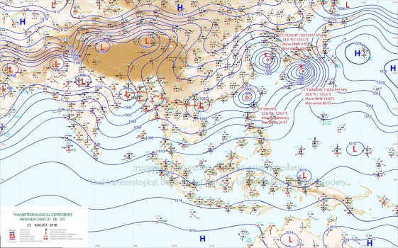 กรมอุตุนิยมวิทยา พยากรณ์อากาศ 24 ชั่วโมงข้างหน้า ประเทศไทยมีฝนเพิ่มขึ้น กับมี ฝนตกหนักมากบางพื้นที่ในภาคใต้ฝั่งตะวันตก บริเวณจังหวัดระนอง พังงา ภูเก็ต กระบี่ ตรัง และสตูล และมีฝนตกหนักบางพื้นที่บริเวณภาคเหนือ ภาคตะวันออกเฉียงเหนือตอนบน และภาคตะวันออก ขอให้ประชาชนในบริเวณดังกล่าวระวังอันตรายจากฝนตกหนัก และฝนตกสะสม ที่ทำให้เกิดน้ำท่วมฉับพลัน น้ำป่าไหลหลากไว้ด้วย สำหรับทะเลอันดามัน มีคลื่นสูงประมาณ 2 เมตร บริเวณที่มีฝนฟ้าคะนองคลื่นสูงมากกว่า 2 เมตร ส่วนอ่าวไทยตอนบนมีคลื่นสูง 1-2 เมตร ขอให้ชาวเรือเดินเรือด้วยความระมัดระวัง สำหรับกรุงเทพมหานครและปริมณฑลมีเมฆเป็นส่วนมาก กับมีฝนฟ้าคะนอง ร้อยละ 60 ของพื้นที่ และมีฝนตกหนักบางแห่ง อนึ่ง พายุดีเปรสชัน มีศูนย์กลางอยู่บริเวณชายฝั่งทางตอนใต้ของเกาะไต้หวัน ประเทศจีน โดยพายุนี้เกือบไม่เคลื่อนที่ และไม่มีผลกระทบต่อลักษณะอากาศของประเทศไทย ขอให้ ผู้ที่จะเดินทางผ่านบริเวณดังกล่าวตรวจสอบสภาพอากาศก่อนออกเดินทางด้วย ส่วนผู้ที่ จะเดินทางไปประเทศเกาหลี และตอนใต้ของประเทศญี่ปุ่น ขอให้ตรวจสอบสภาพอากาศ ก่อนออกเดินทาง เนื่องจากมีพายุไต้ฝุ่น"ซูลิก" (SOULIK) และพายุไต้ฝุ่น"ซีมารอน" (CIMARON) กำลังจะเคลื่อนผ่านบริเวณดังกล่าว ในช่วงวันที่ 23-24 สิงหาคมนี้