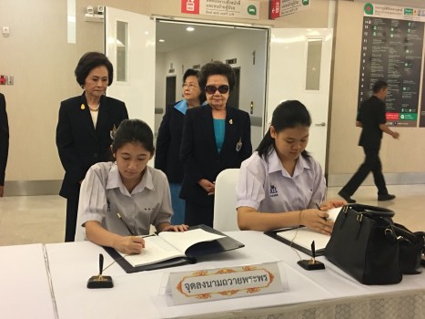 ที่โถงชั้น 1 อาคารภูมิสิริ มังคลานุสรณ์ โรงพยาบาลจุฬาลงกรณ์ สภากาชาดไทย มีประชาชน เดินทางมาลงนามถวายพระพร ให้สมเด็จพระนางเจ้าสิริกิติ์ พระบรมราชินีนาถ ในรัชกาลที่ 9 ทรงหายจากพระอาการประชวร มีพลานามัยสมบูรณ์แข็งแรงโดยเร็ว ด้วยความจงรักภักดี และสำนึกในพระมหากรุณาธิคุณ โดยมีเจ้าหน้าที่สำนักพระราชวัง อำนวยความสะดวก รวมถึงมีการจัดโต๊ะสำหรับทูลเกล้าฯ ถวายแจกันดอกไม้ ซึ่งมีหน่วยงาน องค์กรต่างๆ ทั้งภาครัฐ และภาคเอกชน ทยอยนำแจกัน ดอกไม้มาทูลเกล้าฯ ถวาย ทั้งนี้ สำนักพระราชวัง เปิดให้ลงนามถวายพระพรสมเด็จพระนางเจ้าสิริกิติ์ พระบรมราชินีนาถ ในรัชกาลที่ 9 ระหว่างเวลา 08.00-17.00 น. ( ขอบคุณภาพจากมติชน)