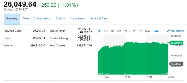 ดัชนีเฉลี่ยอุตสาหกรรมดาวโจนส์ ปิดที่ 26,049.64 จุด เพิ่มขึ้น 259.29 จุด หรือ 1.01%, ดัชนีแนสแดก ปิดที่ 8,017.90 จุด เพิ่มขึ้น 71.92 จุด หรือ 0.91% และดัชนี S&P500 ปิดที่ 2,896.74 จุด เพิ่มขึ้น 22.05 จุด หรือ 0.77% ภาวะการซื้อขายในตลาดหุ้นนิวยอร์กเป็นไปอย่างคึกคัก หลังจากประธานาธิบดี โดนัลด์ ทรัมป์ ประกาศว่า สหรัฐได้บรรลุข้อตกลงทวิภาคีกับเม็กซิโก ซึ่งจะปูทางไปสู่การปรับปรุงข้อตกลงการค้าเสรีอเมริกาเหนือ หรือ นาฟต้า โดยหุ้นกลุ่มอุตสาหกรรมและกลุ่มรถยนต์ ดีดตัวขึ้นขานรับความคืบหน้าทางการค้าระหว่างสหรัฐและเม็กซิโก หุ้นกลุ่มเทคโนโลยีพุ่งขึ้น และช่วยหนุนดัชนีแนสแดกดีดตัวขึ้นปิดที่เหนือระดับ 8,000 จุด เป็นครั้งแรกเมื่อคืน ตลาดหุ้นนิวยอร์กยังได้ปัจจัยหนุนจากการที่ธนาคารกลางจีนส่งสัญญาณว่า ธนาคารกลางกำลังใช้มาตรการเพื่อหนุนค่าเงินหยวน ซึ่งนักวิเคราะห์มองว่าเป็นมาตรการที่จะช่วย ผ่อนคลายความขัดแย้งทางการค้ากับสหรัฐ