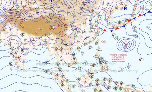 มรสุมตะวันตกเฉียงใต้ที่พัดปกคลุมทะเลอันดามัน ประเทศไทย และอ่าวไทยกำลังอ่อนลง ทำให้ประเทศไทยมีปริมาณฝนลดลง ส่วนภาคเหนือยังคงมีปริมาณฝนมากกว่าภาคอื่น ๆ ขอให้ประชาชนในบริเวณภาคเหนือ ระวังอันตรายจากฝนที่ตกสะสมไว้ด้วย พยากรณ์อากาศ 24 ชั่วโมงข้างหน้า - ภาคเหนือ มีเมฆมาก กับมีฝนฟ้าคะนอง ร้อยละ 40 ของพื้นที่ - ภาคตะวันออกเฉียงเหนือ ภาคกลาง ภาคตะวันออก ภาคใต้(ฝั่งตะวันออก) กรุงเทพมหานครและปริมณฑล มีเมฆเป็นส่วนมาก กับมีฝนฟ้าคะนอง ร้อยละ 30 ของพื้นที่ - ภาคใต้ (ฝั่งตะวันตก) มีฝนฟ้าคะนอง ร้อยละ 20 ของพื้นที่