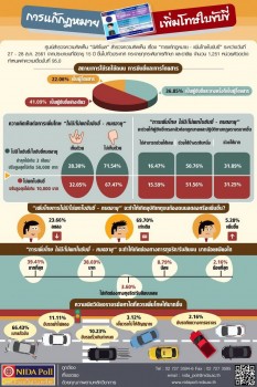 ศูนย์สำรวจความคิดเห็น “นิด้าโพล” สถาบันบัณฑิตพัฒนบริหารศาสตร์ เปิดเผยผลสำรวจความคิดเห็นประชาชน เรื่อง “การแก้กฎหมาย-เพิ่มโทษใบขับขี่” สำรวจระหว่างวันที่ 27-28 สิงหาคม จากประชาชนอายุ 15 ปีขึ้นไป กระจายทุกภูมิภาค ระดับการศึกษา และอาชีพ ทั่วประเทศ 1,251 หน่วยตัวอย่าง เกี่ยวกับการแก้กฎหมายเพิ่มโทษความผิดเกี่ยวกับใบอนุญาตขับรถ โดยการแก้กฎหมายเพิ่มโทษ กรณีไม่มีใบขับขี่/ใบขับขี่หมดอายุ มีโทษจำคุกไม่เกิน 3 เดือน ปรับสูงสุดไม่เกิน 50,000 บาท และกรณีไม่พกใบขับขี่ ปรับสูงสุดไม่เกิน 10,000 บาท พบว่า ประชาชนส่วนใหญ่ ร้อยละ 71.54 ไม่เห็นด้วย กรณีกรมการขนส่งทางบกจะแก้กฎหมาย “การเพิ่มโทษกรณีไม่มีใบขับขี่/ใบขับขี่หมดอายุ” มีเพียงร้อยละ 28.30 ที่เห็นด้วย ส่วน”การเพิ่มโทษกรณีไม่พกใบขับขี่” ประชาชนส่วนใหญ่ ร้อยละ 67.47 ไม่เห็นด้วย มีเพียงร้อยละ 32.05 ที่เห็นด้วย โดยผู้ที่ระบุว่า ไม่เห็นด้วย จะแก้กฎหมาย “การเพิ่มโทษไม่มี/ไม่พกใบขับขี่-หมดอายุ” ให้เหตุผลว่า รุนแรงเกินไป โทษค่าปรับสูงเกินไปไม่เหมาะสมกับฐานความผิด ควรพิจารณาเป็นรายกรณีไป บางส่วนระบุว่าเป็นการแก้ไขปัญหาที่ปลายเหตุและไม่สามารถช่วยลดอุบัติเหตุบนท้องถนนได้ ส่วนผู้ที่เห็นด้วย กับการจะแก้กฎหมาย “การเพิ่มโทษไม่มี/ไม่พกใบขับขี่-หมดอายุ” ให้เหตุผลว่า จะได้มีระเบียบวินัยในการใช้รถใช้ถนน เกิดความเกรงกลัวและเคารพกฎจราจรมากขึ้น ขณะที่บางส่วนระบุว่า สามารถช่วยลดอุบัติเหตุบนท้องถนนได้ ส่วน “การเพิ่มโทษ กรณีไม่มีใบขับขี่/ ใบขับขี่หมดอายุ” จะช่วยให้ผู้ขับขี่เกรงกลัวต่อกฎหมายและปฏิบัติตามกฎจราจรมากขึ้นหรือไม่ ประชาชน ร้อยละ 16.47 ระบุว่าช่วยได้มาก ร้อยละ 50.76 ช่วยได้บ้างระดับหนึ่ง ขณะที่ร้อยละ 31.89 ระบุว่า ไม่สามารถช่วยได้เลย สำหรับ “การเพิ่มโทษกรณีไม่พกใบขับขี่” พบว่า ร้อยละ 15.59 ระบุว่าช่วยได้มาก ร้อยละ 51.56 ช่วยได้บ้างระดับหนึ่ง ขณะที่ร้อยละ 31.25 ไม่สามารถช่วยได้เลย โดยผู้ที่ระบุว่าช่วยได้มาก ให้เหตุผลว่า ทำให้เกิดความเกรงกลัวต่อบทลงโทษที่สูงขึ้น และจะได้ใส่ใจเรื่องใบขับขี่มากขึ้น ผู้ที่ระบุว่า ช่วยได้บ้างระดับหนึ่ง ได้ให้เหตุผลว่า จะเป็นการสร้างวินัยในการใช้รถใช้ถนนให้อยู่ในความไม่ประมาทและปฏิบัติตามกฎจราจร ส่วนผู้ที่ระบุว่า ไม่สามารถช่วยได้เลย ให้เหตุผลว่า ขึ้นอยู่ที่จิตสำนึกของผู้ใช้รถใช้ถนน และการบังคับใช้กฎหมายยังไม่จริงจังและไม่เข้มงวดมากพอ สำหรับ “การเพิ่มโทษกรณีไม่มี/ไม่พกใบขับขี่-หมดอายุ” จะทำให้การเกิดอุบัติเหตุบนท้องถนนลดลงหรือไม่ ร้อยละ 5.28 ระบุว่าเพิ