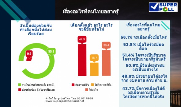 นายนพดล กรรณิกา ผู้อำนวยการสำนักวิจัยซูเปอร์โพล (SUPER POLL) สรุปผลสำรวจ เรื่อง ‘เรื่องอะไรที่คนไทยอยากรู้’ จากประชาชนทุกสาขาอาชีพทั่วประเทศ 1,129 ตัวอย่าง ดำเนินโครงการระหว่าง วันที่ 15 สิงหาคม-1 กันยายน พบว่า เรื่องที่คนไทยส่วนใหญ่หรือร้อยละ 56.1 อยากรู้ คือ จะเลือกตั้งเมื่อไหร่แน่ ร้อยละ 53.8 อยากรู้เมื่อไหร่จะปลดล็อค ร้อยละ 51.4 อยากรู้ใครจะเป็นรัฐบาล ใครจะเป็นนายกรัฐมนตรี ร้อยละ 50.9 อยากรู้ชีวิตประชาชนจะเป็นอย่างไร ตามด้วย ประชาชนได้อะไรจากงบหลายล้านล้าน บาท อยากรู้นักการเมืองไม่ดีจะเข็ดหลาบจำหรือไม่ ใครจะจัดการพวกนี้ได้จริง อยากรู้จะเผาบ้านเผาเมืองกันอีกหรือไม่ อยากรู้คนไทยจะยอมรับคนโกงชาติบ้านเมืองต่อไปหรือไม่ ที่น่าสนใจ คือ จำนวนมากหรือร้อยละ 44.9 คิดว่า เลือกตั้งแล้วอะไร อะไร น่าจะดีขึ้น ขณะที่ร้อยละ 18.7 ไม่คิดว่าจะดีขึ้น และเกินกว่า 1 ใน 3 หรือ ร้อยละ 36.4 ไม่แน่ใจ ที่น่าพิจารณา คือ เกินครึ่งหรือร้อยละ 54.7 คิดว่า นับจากวันนี้เป็นต้นไปความร้อนแรงทางการเมืองจะเพิ่มขึ้น ขณะที่ร้อยละ 39.9 ระบุจะเหมือนเดิม และร้อยละ 5.4 ระบุจะลดลง นอกจากนี้ ส่วนใหญ่หรือร้อยละ 90.1 ระบุจำเป็นค่อนข้างมากถึงมากที่สุด ที่ทุกฝ่ายต้องช่วยกันทำให้เลือกตั้งเกิดขึ้นด้วยความสงบเรียบร้อย พิสูจน์ให้คนทั้งโลกยกย่องประเทศไทยได้อีกเรื่องหนึ่ง ขณะที่ร้อยละ 9.9 ระบุจำเป็นค่อนข้างน้อย ถึง ไม่จำเป็นเลย