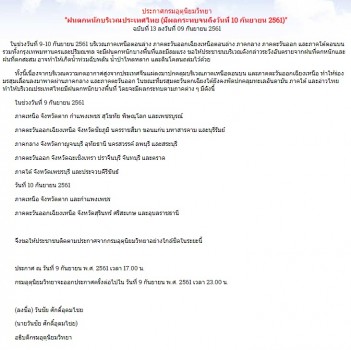 ช่วงวันที่ 9-10 กันยายน บริเวณภาคเหนือตอนล่าง ภาคตะวันออกเฉียงเหนือตอนล่าง ภาคกลาง ภาคตะวันออก และภาคใต้ตอนบน รวมทั้งกรุงเทพมหานครและปริมณฑล จะมีฝนตกหนักบางพื้นที่และมีลมแรง ขอให้ประชาชนบริเวณดังกล่าวระวังอันตรายจากฝนที่ตกหนักและฝนที่ตกสะสม อาจทำให้เกิดน้ำท่วมฉับพลัน น้ำป่าไหลหลาก และดินโคลนถล่มไว้ด้วย เนื่องจากบริเวณความกดอากาศสูงจากประเทศจีนแผ่ลงมาปกคลุมบริเวณภาคเหนือตอนบน และภาคตะวันออกเฉียงเหนือ ทำให้ร่องมรสุมเลื่อนลงมาพาดผ่านภาคกลาง และภาคตะวันออก ในขณะที่มรสุมตะวันตกเฉียงใต้ยังคงพัดปกคลุมทะเลอันดามัน ภาคใต้ และอ่าวไทย ทำให้บริเวณประเทศไทยมีฝนตกหนักบางพื้นที่ โดยจะมีผลกระทบตามภาคต่าง ๆ มีดังนี้ วันนี้ (9 กันยายน) ภาคเหนือ จังหวัดตาก กำแพงเพชร สุโขทัย พิษณุโลก และเพชรบูรณ์ ภาคตะวันออกเฉียงเหนือ จังหวัดชัยภูมิ นครราชสีมา ขอนแก่น มหาสารคาม และบุรีรัมย์ ภาคกลาง จังหวัดกาญจนบุรี อุทัยธานี นครสวรรค์ ลพบุรี และสระบุรี ภาคตะวันออก จังหวัดฉะเชิงเทรา ปราจีนบุรี จันทบุรี และตราด ภาคใต้ จังหวัดเพชรบุรี และประจวบคีรีขันธ์ วันพรุ่งนี้ (10 กันยายน) ภาคเหนือ จังหวัดตาก และกำแพงเพชร ภาคตะวันออกเฉียงเหนือ จังหวัดสุรินทร์ ศรีสะเกษ และอุบลราชธานี จึงขอให้ประชาชนติดตามประกาศจากกรมอุตุนิยมวิทยาอย่างใกล้ชิดในระยะนี้