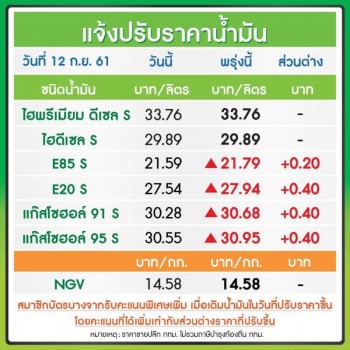 บริษัท ปตท. น้ำมันและการค้าปลีก จำกัด และบริษัทบางจากคอร์ปอเรชั่น จำกัด (มหาชน) ประกาศปรับราคาขายปลีกน้ำมันกลุ่มเบนซินและแก๊สโซฮอลล์ เพิ่มขึ้น 40 สตางค์ต่อลิตร เว้น E85 เพิ่มขึ้น 20 สตางค์ ส่วนดีเซล ราคาคงเดิม มีผลตั้งแต่วันพรุ่งนี้ (13 ก.ย.) เวลา 05.00 น. เป็นต้นไป โดยราคาขายปลีกจะเป็นดังนี้ ดีเซล อยู่ที่ 29.89 บาทต่อลิตร E85 อยู่ที่ 21.79 บาทต่อลิตร E20 อยู่ที่ 27.94 บาทต่อลิตร แก๊สโซฮอล์ 91 อยู่ที่ 30.68 บาทต่อลิตร แก๊สโซฮอล์ 95 อยู่ที่ 30.95 บาทต่อลิตร ทั้งนี้ ราคาดังกล่าวยังไม่รวมภาษีมูลค่าเพิ่ม
