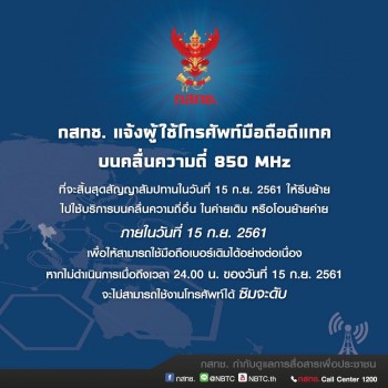 เว็บไซด์สำนักงานคณะกรรมการกิจการกระจายเสียง กิจการโทรทัศน์ และกิจการ โทรคมนาคมแห่งชาติ หรือ กสทช. ประกาศว่า กสทช.แจ้งผู้ใช้โทรศัพท์มือถือดีแทค บนคลื่นความถี่ 850 เมกะเฮิร์ซที่จะสิ้นสุดสัญญาสัมปทานในวันที่ 15 ก.ย.2561 ให้รีบย้าย ไปใช้บริการบนคลื่นความถี่อื่นในค่ายเดิม หรือโอนย้ายค่าย ภายในวันที่ 15 ก.ย.นี้ เพื่อให้ สามารถใช้มือถือเบอร์เดิมได้อย่างต่อเนื่อง หากไม่ดำเนินการเมื่อถึงเวลา 24.00 น.ของวันที่ 15 ก.ย.2561 จะไม่สามารถใช้งานโทรศัพท์ได้ ซิมจะดับ ทั้งนี้ ผู้ที่ใช้ดีแทค สามารถตรวจสอบว่าหมายเลขของท่านได้รับผลกระทบหรือไม่ให้ กด *444# แล้วโทรออก และจะได้รับข้อความตอบกลับทันที