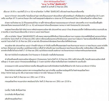 ประกาศกรมอุตุนิยมวิทยา "พายุ “บารีจัต” (BARIJAT) " ฉบับที่ 10 ลงวันที่ 13 กันยายน 2561 เมื่อเวลา 16.00 น. ของวันนี้ (13 ก.ย. 61) พายุโซนร้อน “บารีจัต” (BARIJAT) บริเวณด้าน ตะวันออกเฉียงเหนือของเกาะไหหลำ ประเทศจีน ได้เคลื่อนเข้าสู่อ่าวตังเกี๋ยและอ่อนกำลังลง เป็นพายุดีเปรสชันแล้ว มีความเร็วลมสูงสุดใกล้ศูนย์กลาง ประมาณ 55 กิโลเมตรต่อชั่วโมง กำลังเคลื่อนตัวทางทิศตะวันตก ด้วยความเร็วประมาณ 22 กิโลเมตรต่อชั่วโมง พายุนี้กำลัง จะเคลื่อนผ่านตอนบนของเกาะไหหลำ ประเทศจีน คาดว่าจะเคลื่อนขึ้นสู่ฝั่งประเทศเวียดนาม ตอนบนวันนี้ (13 ก.ย. 61) แล้วจะอ่อนกำลังลงเป็นหย่อมความกดอากาศต่ำในระยะต่อไป ประกอบกับมรสุมตะวันตกเฉียงใต้กำลังปานกลางพัดปกคลุมทะเลอันดามัน ประเทศไทย และอ่าวไทย ลักษณะเช่นนี้ทำให้มีฝนตกหนักบางแห่งบริเวณภาคเหนือ ภาคตะวันออกเฉียงเหนือ ภาคกลาง และภาคตะวันออก อนึ่ง พายุไต้ฝุ่น “มังคุด” (MANGKHUT) บริเวณมหาสมุทรแปซิฟิกมีแนวโน้ม จะเคลื่อนผ่านเกาะลูซอน ประเทศฟิลิปปินส์ และตอนใต้ของเกาะไต้หวัน ในช่วงวันที่ 14-15 กันยายน หลังจากนั้นจะเคลื่อนลงทะเลจีนใต้ตอนบน และผ่านเกาะฮ่องกง โดยจะเคลื่อนขึ้นฝั่งประเทศจีนตอนใต้ ในช่วงวันที่ 16-18 กันยายนตามลำดับ ซึ่งจะส่ง ผลให้มรสุมตะวันตกเฉียงใต้ที่พัดปกคลุมทะเลอันดามัน ประเทศไทย และอ่าวไทย มีกำลังแรง ทำให้บริเวณพื้นที่รับลมมรสุมด้านตะวันตกของภาคกลาง ภาคตะวันออก และภาคใต้ฝั่งตะวันตก มีฝนตกอย่างต่อเนื่อง และมีฝนตกหนักบางพื้นที่ สำหรับบริเวณภาคเหนือและภาคตะวันออกเฉียงเหนือ จะมีฝนเพิ่มมากขึ้นและมีฝนตกหนักเกิดขึ้นได้ ในช่วงวันที่ 17-19 กันยายน ขอให้ประชาชนบริเวณดังกล่าวระวังผลกระทบจากฝนตกหนักและฝนตกสะสมที่อาจทำให้เกิดน้ำท่วมฉับพลัน น้ำป่าไหลหลาก น้ำล้นตลิ่ง รวมถึงดินโคลนถล่ม สำหรับคลื่นลมบริเวณทะเลอันดามันและอ่าวไทยตอนบน ในช่วงวันที่ 16-19 กันยายน จะมีกำลังแรงขึ้น โดยบริเวณทะเลอันดามันมีคลื่นสูง 2-4 เมตร และอ่าวไทยตอนบน มีคลื่นสูง 2-3 เมตร ขอให้ชาวเรือควรเดินเรือด้วยความระมัดระวัง และเรือเล็ก ควรงดออกจากฝั่ง และขอให้ประชาชนที่อาศัยอยู่บริเวณชายฝั่งให้ระมัดระวังคลื่นที่ซัด เข้าหาฝั่ง ในช่วงเวลาดังกล่าวไว้ด้วย จึงขอให้ประชาชนติดตามประกาศจากกรมอุตุนิยมวิทยาอย่างใกล้ชิด และติดตามข้อมูล ที่เว็บไซต์กรมอุตุนิยมวิทยา http://www.tmd.go.th หรือ สายด่วนพยากรณ์อากาศ 1182 ได้ตลอด 24 ชั่วโมง