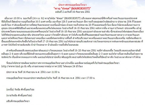 ประกาศกรมอุตุนิยมวิทยา "พายุ “มังคุด” (MANGKHUT)" ฉบับที่ 2 ลงวันที่ 14 กันยายน 2561 เมื่อเวลา 10.00 น. ของวันนี้ (14 ก.ย. 61) พายุไต้ฝุ่น “มังคุด” (MANGKHUT) บริเวณมหาสมุทรแปซิฟิกหรือด้านตะวันออกของประเทศฟิลิปปินส์ มีความเร็วลมสูงสุดใกล้ศูนย์กลาง ประมาณ 204 กิโลเมตรต่อชั่วโมง กำลังเคลื่อนตัวทางทิศตะวันตกค่อนทางเหนือเล็กน้อย ด้วยความเร็วประมาณ 20 กิโลเมตรต่อชั่วโมง มีแนวโน้มจะเคลื่อนผ่านเกาะลูซอน ของประเทศฟิลิปปินส์ และจะเคลื่อนลงทะเลจีนใต้ตอนบน ในช่วงวันที่ 14-15 กันยายน หลังจากนั้น ผ่านเกาะไหหลำ ประเทศจีน เข้าสู่ประเทศเวียดนามตอนบนและประเทศจีนตอนใต้ ในช่วงวันที่ 16-18 กันยายน และอ่อนกำลังลงตามลำดับ ซึ่งจะส่งผลให้มรสุมตะวันตกเฉียงใต้ที่พัดปกคลุมทะเลอันดามันประเทศไทย และอ่าวไทย มีกำลังแรง ทำให้บริเวณพื้นที่รับลมมรสุมด้านตะวันตกของภาคกลาง ภาคตะวันออก และ ภาคใต้ฝั่งตะวันตก มีฝนตกอย่างต่อเนื่อง และมีฝนตกหนักบางพื้นที่ สำหรับบริเวณภาคเหนือ และภาคตะวันออกเฉียงเหนือ จะมีฝนเพิ่มมากขึ้นและมีฝนตกหนักเกิดขึ้นได้ช่วงวันที่ 17-19 กันยายน ขอให้ประชาชนบริเวณดังกล่าวระวังผลกระทบจากฝนตกหนักและฝนตกสะสม ที่อาจทำให้เกิดน้ำท่วมฉับพลัน น้ำป่าไหลหลาก น้ำล้นตลิ่ง รวมถึงดินโคลนถล่ม สำหรับคลื่นลมบริเวณทะเลอันดามันและอ่าวไทยตอนบน ในช่วงวันที่ 16-20 กันยายน จะมีกำลังแรงขึ้น โดยบริเวณทะเลอันดามันมีคลื่นสูง 2-4 เมตร บริเวณที่มีฝนฟ้าคะนอง ทะเลมีคลื่นสูงกว่า 4 เมตร และอ่าวไทยตอนบนมีคลื่นสูง 2-3 เมตร ขอให้ชาวเรือควรเดินเรือ ด้วยความระมัดระวัง เรือเล็กควรงดออกจากฝั่ง และขอให้ประชาชนที่อาศัยอยู่บริเวณ ชายฝั่งให้ระมัดระวังคลื่นที่ซัดเข้าหาฝั่ง ในช่วงเวลาดังกล่าวไว้ด้วย จึงขอให้ประชาชนติดตามประกาศจากกรมอุตุนิยมวิทยาอย่างใกล้ชิด และติดตามข้อมูลที่ เว็บไซต์กรมอุตุนิยมวิทยา http://www.tmd.go.th หรือ สายด่วนพยากรณ์อากาศ 1182 ได้ตลอด 24 ชั่วโมง