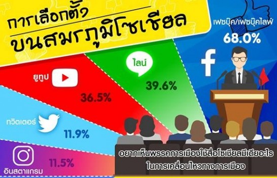 “กรุงเทพโพลล์” ศูนย์วิจัยมหาวิทยาลัยกรุงเทพ สำรวจความคิดเห็นประชาชน เรื่อง “การเลือกตั้งบนสมรภูมิโซเชียล” เก็บข้อมูลกับประชาชนจากทุกภูมิภาคทั่วประเทศ จำนวน 1,201 คน ระหว่างวันที่ 11-13 ก.ย.ที่ผ่านมา พบว่า ประชาชนส่วนใหญ่ถึงร้อยละ 68.0 อยากเห็นพรรรคการเมืองใช้สื่อโซเชียลมีเดีย เฟซบุ๊ก/เฟซบุ๊กไลฟ์ ในการเคลื่อนไหว ทางการเมือง ,ร้อยละ 39.6 อยากเห็นใช้สื่อโซเชียลมีเดีย ไลน์ และ ร้อยละ 36.5 ใช้สื่อโซเชียลมีเดีย ยูทูป ประชาชนร้อยละ 51.4 เห็นว่า การใช้สื่อโซเชียลมีเดียเผยแพร่ข้อมูลข่าวสารของ พรรคการเมืองต่างๆ จะเกิดผลดี เข้าถึงข้อมูลพรรคการเมืองได้ง่ายขึ้น , คนรุ่นใหม่ จะมีส่วนร่วมทางการเมืองมากขึ้น ร้อยละ 48.6 เห็นว่าจะเกิดผลเสีย เพราะข้อมูลที่ได้อาจไม่น่าเชื่อถือ มีการบิดเบือนและ จะมีการแสดงความเห็นใส่ร้ายโจมตีคู่แข่ง ทำให้เกิดความขัดแย้ง ประชาชนร้อยละ 63.0 มองว่า หากมีการเสนอข้อมูลต่างๆทางการเมือง ผ่านเน็ตไอดอล หรือ ผู้มีอิทธิพลทางความคิด จะมีผลต่อการเลือกตั้งค่อนข้างมาก และร้อยละ 47.9 ไม่เห็นด้วย หากมีการห้ามใช้โซเชียลมีเดียหาเสียง เพราะจะรู้สึกเหมือนถูกปิดกั้นข้อมูล ,เหมือนประเทศ ยังไม่พัฒนา ไม่มีอิสระ แต่ร้อยละ 34.3 มองว่าถ้าใช้โซเชียลหาสียง ประเทศจะวุ่นวายแตกแยก