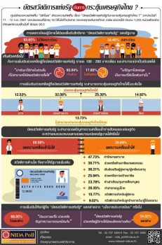 นิด้าโพล สถาบันบัณฑิตพัฒนบริหารศาสตร์ เปิดเผยผลสำรวจความคิดเห็นของประชาชน เรื่อง “บัตรสวัสดิการแห่งรัฐกับการกระตุ้นเศรษฐกิจไทย?” จากความคิดเห็นของประชาชนทั่วประเทศ 1,253 คน ระหว่างวันที่ 11-12 ก.ย. พบว่า ประชาชนส่วนใหญ่ ร้อยละ 65.60 ไม่ได้ลงทะเบียนผู้มีรายได้น้อยเพื่อรับสิทธิจากบัตรสวัสดิการแห่งรัฐ ขณะที่ร้อยละ 34.40 ลงทะเบียน ด้านความคิดเห็นของประชาชน เกี่ยวกับการเพิ่มเงินช่วยเหลือแก่ผู้ที่ถือบัตรสวัสดิการแห่งรัฐ สามารถเบิกเป็นเงินสดเพื่อนำไปชำระค่าบริการอื่น ๆ ได้ ร้อยละ 80.84 ระบุว่า เห็นด้วย เพราะ ประชาชนผู้มีรายได้น้อยจะได้นำเงินมาใช้จ่ายในส่วนอื่นที่ไม่สามารถใช้บัตรสวัสดิการซื้อได้ มีเพียงร้อยละ 17.80 ที่ไม่เห็นด้วย เพราะเป็นการแก้ปัญหาที่ไม่ตรงจุด สามารถแก้ได้เพียงเบื้องต้นเท่านั้น ส่วนการเพิ่มเงินช่วยเหลือแก่ผู้ที่ถือบัตรสวัสดิการแห่งรัฐจะสามารถช่วยกระตุ้นเศรษฐกิจไทยได้ในระดับใด ร้อยละ 12.53 ระบุสามารถช่วยกระตุ้นเศรษฐกิจไทยได้มาก ร้อยละ 32.08 ระบุว่า สามารถช่วยกระตุ้นเศรษฐกิจไทยได้ค่อนข้างมาก ขณะที่ร้อยละ 25.30 ระบุว่า สามารถช่วยกระตุ้นเศรษฐกิจไทยได้ค่อนข้างน้อย ส่วนบัตรสวัสดิการแห่งรัฐ จะสามารถลดปัญหาความเหลื่อมล้ำทางสังคมและเศรษฐกิจ ระหว่างคนรวย/คนจน ตามเจตนารมณ์ของรัฐบาล ได้หรือไม่ ร้อยละ 68.08 ระบุว่า ไม่สามารถลดปัญหาความเหลื่อมล้ำได้ เพราะเป็นการแก้ไขปัญหาที่ปลายเหตุ ช่วยเหลือได้เพียงเฉพาะหน้าเท่านั้น มีเพียงร้อยละ 28.89 ที่ระบุว่า สามารถลดปัญหาความเหลื่อมล้ำได้ เพราะ เป็นแนวทางการแก้ปัญหาที่คนจนได้ประโยชน์อย่างแท้จริง และทำให้ปัญหาความยากจนลดลง สำหรับข้อเสนอให้รัฐบาลเพิ่มสวัสดิการในด้านใดบ้าง 5 อันดับแรก พบว่า อันดับ 1 ร้อยละ 47.73 ค่ารักษาพยาบาล อันดับ 2 ร้อยละ 38.71 การช่วยเหลืออาชีพด้านเกษตรกรรม อันดับ 3 ร้อยละ 36.31 เงินส่งเสริมผู้สูงอายุ/ผู้เกษียณอายุ อันดับ 4 ร้อยละ 25.94 ช่วยเหลือการสร้างอาชีพ และอันดับ 5 ร้อยละ 23.78 ค่าการศึกษา/ค่าเล่าเรียน/ทุนการศึกษาบุตร เมื่อถามว่า บัตรสวัสดิการแห่งรัฐแตกต่างจากนโยบายประชานิยมหรือไม่ ร้อยละ 66 ระบุว่า ไม่แตกต่าง เพราะมีแนวทางในการแก้ไข ช่วยเหลือปัญหาความยากจนเหมือนกัน แค่ใช้ชื่อเรียกที่ต่างกัน มีเพียงร้อยละ 24.02 ที่ระบุว่าแตกต่าง เพราะบัตรสวัสดิการแห่งรัฐช่วยเหลือผู้ที่มีรายได้น้อยเพียงอย่างเดียว