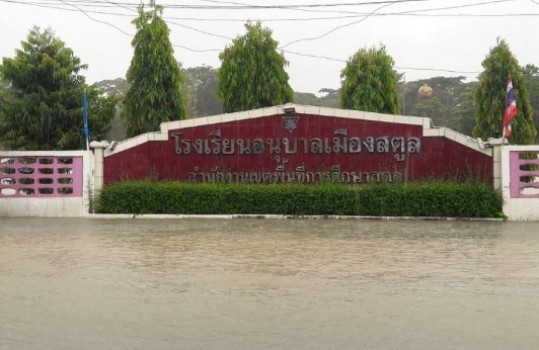 น.ส.สุนารี บุญชุบ หัวหน้าป้องกันบรรเทาสาธารณภัยจังหวัดสตูล สรุปพื้นที่น้ำท่วม จากหย่อมความกดอากาศต่ำที่พาดผ่านส่งผลให้เกิดฝนตกหนักมาหลายวัน 30 หมู่บ้าน 10 ตำบล 4 อำเภอ ได้แก่ อ.เมือง ควนกาหลง ละงู และท่าแพ ประชาชนเดือดร้อน 448 ครัวเรือน 1,550 คน โดยในย่านเศรษฐกิจ ตลาดสดเทศบาลตำบลฉลุง ผู้ค้าต้องย้ายแผงหนีน้ำไปตั้งขายชั่วคราวริมฟุตบาท นอกจากนี้ น้ำท่วมยังขยายวงกว้างออกไปท่วมโรงเรียนในเขตอำเภอเมืองสตูล 3 โรง คือ โรงเรียนบ้านย่านซื่อ มิตรภาพ 147 , โรงเรียนบ้านโคกประดู่ และโรงเรียนอนุบาลเมืองสตูล หมู่ 1 ต.ฉลุง ปริมาณน้ำที่มาจากต้นน้ำได้ไหลมารวมกันภายในโรงเรียน ตั้งแต่กลางดึกคืนที่ผ่านมา ถนนยนตราการกำธร หน้าโรงเรียนอนุบาลเมืองสตูล น้ำท่วมฝั่งขาออกตัวเมือง และเส้นทางฉลุง–ละงู หมู่ 4 บ้านท่าคลอง ต.ฉลุง น้ำท่วมทั้ง 2 ช่องทาง กระแสน้ำไหลค่อนข้างแรง การจราจรติดขัด เจ้าหน้าที่ท้องถิ่นและหลายหน่วยงาน ช่วยกันอำนวยความสะดวกการจราจร นายวิรัต สวัสดี ผู้อำนวยการโรงเรียนอนุบาลเมืองสตูล เปิดเผยว่า ได้ให้เจ้าหน้าที่นขนย้ายอุปกรณ์การเรียนการสอนขึ้นไว้บนที่สูงไว้ก่อนแล้ว อย่างไรก็ตาม น้ำไหลเข้าท่วมอย่างรวดเร็วและมีแนวโน้มเพิ่มขึ้น เพราะกลุ่มฝนยังคงตกหนักกระจายทั่วพื้นที่ ประกอบกับสถานที่ตั้งของโรงเรียน เป็นจุดรับน้ำก่อนไหลออกสู่ทะเล ปีที่ผ่านมาถูกน้ำท่วมถึง 3 ครั้ง จึงได้ประกาศหยุดเรียนชั่วคราว 1 วัน ในวันพรุ่งนี้ และจะประเมินสถานการณ์น้ำรายวันก่อนประกาศต่อไป