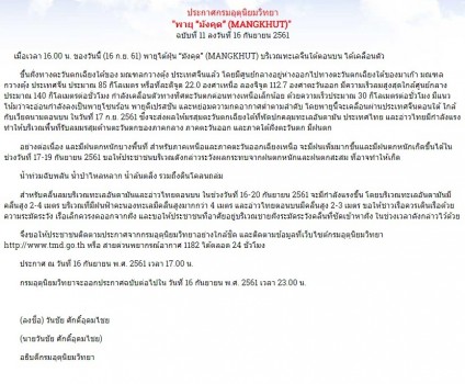 ประกาศกรมอุตุนิยมวิทยา "พายุมังคุด” ฉบับที่ 11 เมื่อเวลา 16.00 น. พายุไต้ฝุ่น “มังคุด” บริเวณทะเลจีนใต้ตอนบน เคลื่อนตัวขึ้นฝั่งทางตะวันตกเฉียงใต้ของมณฑลกวางตุ้ง ประเทศจีนแล้ว โดยมีศูนย์กลางอยู่ห่างออกไปทางตะวันตกเฉียงใต้ของมาเก๊า มณฑลกวางตุ้ง ประเทศจีน ประมาณ 85 กิโลเมตร มีความเร็วลมสูงสุดใกล้ศูนย์กลาง ประมาณ 140 กิโลเมตรต่อชั่วโมง กำลังเคลื่อนตัวทางทิศตะวันตกค่อนทางเหนือเล็กน้อย ด้วยความเร็วประมาณ 30 กิโลเมตรต่อชั่วโมง มีแนวโน้มว่าจะอ่อนกำลังลงเป็นพายุโซนร้อน พายุดีเปรสชัน และหย่อมความกดอากาศต่ำตามลำดับ โดยพายุนี้จะเคลื่อนผ่านประเทศจีนตอนใต้ ใกล้เวียดนามตอนบน ในวันที่ 17 ก.ย. ซึ่งจะส่งผลให้มรสุมตะวันตกเฉียงใต้ที่พัดปกคลุมทะเลอันดามัน ประเทศไทย และอ่าวไทยมีกำลังแรง ทำให้บริเวณพื้นที่รับลมมรสุมด้านตะวันตกของภาคกลาง ภาคตะวันออก และภาคใต้ฝั่งตะวันตก มีฝนตก อย่างต่อเนื่อง และมีฝนตกหนักบางพื้นที่ สำหรับภาคเหนือและภาคตะวันออกเฉียงเหนือ จะมีฝนเพิ่มมากขึ้นและมีฝนตกหนักเกิดขึ้นได้ในช่วงวันที่ 17-19 กันยายน 2561 ขอให้ประชาชนบริเวณดังกล่าวระวังผลกระทบจากฝนตกหนักและฝนตกสะสม ที่อาจทำให้เกิดน้ำท่วมฉับพลัน น้ำป่าไหลหลาก น้ำล้นตลิ่ง รวมถึงดินโคลนถล่ม ส่วนคลื่นลมบริเวณทะเลอันดามันและอ่าวไทยตอนบน ช่วงวันที่ 16-20 กันยายน จะมีกำลังแรงขึ้น โดยบริเวณทะเลอันดามันมีคลื่นสูง 2-4 เมตร บริเวณที่มีฝนฟ้าคะนองทะเลมีคลื่นสูงมากกว่า 4 เมตร และอ่าวไทยตอนบนมีคลื่นสูง 2-3 เมตร ขอให้ชาวเรือควรเดินเรือด้วยความระมัดระวัง เรือเล็กควรงดออกจากฝั่ง และขอให้ประชาชนที่อาศัยอยู่บริเวณชายฝั่งระมัดระวังคลื่นที่ซัดเข้าหาฝั่ง ในช่วงเวลาดังกล่าวไว้ด้วย จึงขอให้ประชาชนติดตามประกาศจากกรมอุตุนิยมวิทยาอย่างใกล้ชิด และติดตามข้อมูลที่เว็บไซต์กรมอุตุนิยมวิทยา http://www.tmd.go.th หรือ สายด่วนพยากรณ์อากาศ 1182 ได้ตลอด 24 ชั่วโมง
