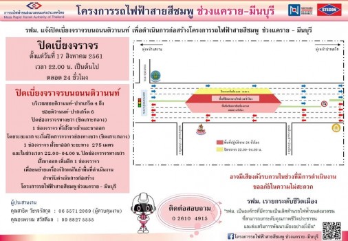 การรถไฟฟ้าขนส่งมวลชนแห่งประเทศไทย หรือ รฟม. แจ้งว่า วันนี้ (18 ก.ย.) ตั้งแต่เวลา 22.00 น.เป็นต้นไป โครงการรถไฟฟ้าสายสีชมพู ช่วงแคราย - มีนบุรี มีความจำเป็นต้อง ปิดช่องจราจร 1 ช่องทางขวา (ชิดเกาะกลาง) ฝั่งขาเข้าและขาออก ตลอด 24 ชั่วโมง บนถนนติวานนท์ ตั้งแต่บริเวณซอยติวานนท์ - ปากเกร็ด 4 ถึงซอยติวานนท์ - ปากเกร็ด 6 เพื่อดำเนินการก่อสร้างโครงการรถไฟฟ้าสายสีชมพู ช่วงแคราย - มีนบุรี ทั้งนี้ ขออภัย ในความไม่สะดวก และผู้ใช้เส้นทางชะลอความเร็วก่อนถึงพื้นที่ดำเนินงาน