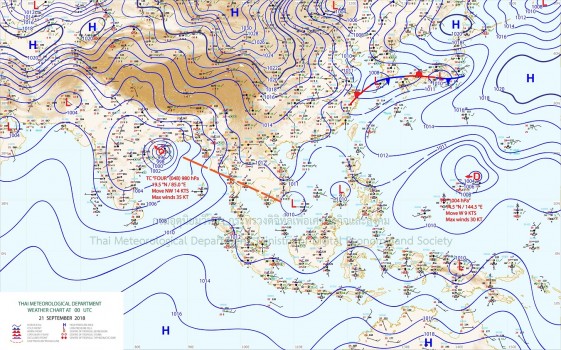 กรมอุตุนิยมวิทยา พยากรณ์อากาศ 24 ชั่วโมงข้างหน้า บริเวณภาคเหนือ และ ภาคตะวันออกเฉียงเหนือตอนบน มีปริมาณฝนลดลง ส่วนภาคกลาง ภาคตะวันออก และภาคใต้ยังคงมีฝนตกต่อเนื่อง โดยภาคใต้ฝั่งตะวันออกจะมีฝนตกหนักบางแห่ง ขอให้ประชาชนบริเวณภาคกลาง ภาคตะวันออก และภาคใต้ระวังอันตรายจากฝน ที่ตกสะสมไว้ด้วย สำหรับกรุงเทพมหานครและปริมณฑล มีเมฆเป็นส่วนมาก กับมีฝนฟ้าคะนอง ร้อยละ 40 ของพื้นที่