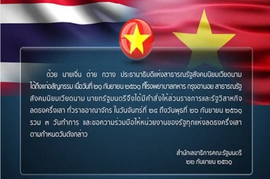 เว็บไซต์สำนักเลขาธิการคณะรัฐมนตรี เปิดเผยว่า ด้วยกรณีนายเจิ้น ด่าย กวาง ประธานาธิบดี เวียดนาม ถึงแก่อสัญกรรมแล้วด้วยวัย 61 ปี ที่โรงพยาบาลทหาร ในกรุงฮานอย ประเทศ เวียดนามเมื่อวันที่ 21 ก.ย.พล.อ.ประยุทธ์ จันทร์โอชา นายกรัฐมนตรี จึงมีคำสั่งให้ส่วนราชการ และรัฐวิสาหกิจลดธงครึ่งเสาทั่วราชอาณาจักร ในวันจันทร์ที่ 24-26 ก.ย.2561 รวม 3 วัน ทำการ และขอความร่วมมือให้หน่วยงานของรัฐทุกแห่ง ลดธงครึ่งเสา ตามกำหนดวันดังกล่าว ขณะเดียวกัน สำนักโฆษก สำนักเลขาธิการนายกรัฐมนตรี แจ้งว่า นายกรัฐมนตรีจะเดินทาง ไปยังสถานเอกอัครราชทูตเวียดนามประจำประเทศไทย ในวันที่ 24 ก.ย.นี้ เวลา 11.30 น. เพื่อร่วมลงนามแสดงความเสียใจต่อการถึงแก่อสัญกรรมของประธานาธิบดีเวียดนามด้วย