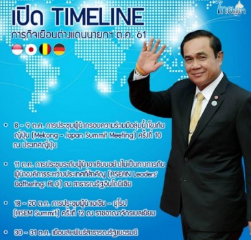 พล.ท.วีรชน สุคนธปฏิภาค รองโฆษกประจำสำนักนายกรัฐมนตรี เปิดเผยว่า พล.อ.ประยุทธ์ จันทร์โอชา นายกรัฐมนตรีและหัวหน้าคณะรักษาความสงบแห่งชาติ มีกำหนดเดินทางไปต่างประเทศตลอดเดือน ต.ค.นี้ เริ่มจาก การประชุมผู้นำกรอบความร่วมมือลุ่มน้ำโขงกับญี่ปุ่น ที่ประเทศญี่ปุ่น , การประชุมระดับผู้นำอาเซียนอย่างไม่เป็นทางการ กับผู้นำองค์การระหว่างประเทศที่สำคัญ ด้านการเงิน การธนาคาร และเศรษฐกิจ ที่ประเทศอินโดนีเซีย , การประชุมผู้นำเอเชีย-ยุโรป หรือ อาเซ็ม ที่ประเทศเบลเยียม และการเยือนประเทศเยอรมนี เพื่อหารือทวิภาคีตามคำเชิญของ ประธานาธิบดีเยอรมนี โดยมุ่งหวังขยายความร่วมมือ กระชับความสัมพันธ์ และส่งเสริมบทบาทของไทยในเวทีโลก และระหว่างนั้นมีสื่อมวลชนต่างชาติชื่อดังหลายสำนักให้ความสนใจขอสัมภาษณ์นายกรัฐมนตรี จึงต้องพิจารณาถึงความเหมาะสมกับช่วงเวลา ส่วน พล.อ.ประยุทธ์ จะเปิดเผยอนาคตทางการเมืองที่ชัดเจนด้วยหรือไม่นั้น ไม่สามารถระบุได้ แต่ทุกครั้งที่นายกรัฐมนตรีเดินทางไปต่างประเทศ นอกจากภารกิจตามวัตถุประสงค์ในการเดินทางเยือนหรือประชุมแล้ว จะใช้โอกาสนี้ชี้แจงความก้าวหน้าการเตรียมการสู่การเลือกตั้ง เบื้องต้นกำหนดไว้ ว่าจะเป็นช่วงปลายเดือน ก.พ.2562