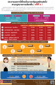ศูนย์สำรวจความคิดเห็น “นิด้าโพล” สถาบันบัณฑิตพัฒนบริหารศาสตร์ เปิดเผยผลสำรวจความคิดเห็นประชาชน เรื่อง “ประชาชนอยากได้ใครเป็นนายกรัฐมนตรีคนต่อไป ตามกฎหมายการเลือกตั้งปัจจุบัน (ครั้งที่ 4)” สำรวจระหว่างวันที่ 17-18 กันยายน จากประชาชนที่อายุ 18 ปีขึ้นไป กระจายทุกภูมิภาค ระดับการศึกษา และอาชีพทั่วประเทศ 1,251 หน่วยตัวอย่าง พบว่า พรรคการเมืองที่ประชาชนอยากให้เข้ามาเป็นรัฐบาลในการเลือกตั้งครั้งต่อไป ส่วนใหญ่ ร้อยละ 61.63 ระบุ พรรคการเมืองใหม่ ๆ เพราะอยากเห็นคนใหม่ ๆ นโยบายใหม่ ๆ แนวคิดใหม่ ๆ เข้ามาบริหารและพัฒนาประเทศไปในทิศทางที่ดีขึ้น และบางส่วนระบุว่า เบื่อการบริหารงานของพรรคการเมืองพรรคเก่า ขณะที่ร้อยละ 37.49 อยากได้พรรคการเมืองเก่า เพราะมีความรู้ ความสามารถ และประสบการณ์ บริหารงานดีอยู่แล้ว การทำงานมีระบบ เคยเห็นผลงานมาแล้ว มั่นใจในผลงาน รู้จัก คุ้นเคยกับประชาชนเป็นอย่างดี เข้าใจและสามารถแก้ไขปัญหาได้ดีกว่าพรรคการเมืองใหม่ สำหรับบุคคลที่ประชาชนอยากให้เป็นนายกรัฐมนตรี ตามกฎหมายการเลือกตั้งปัจจุบัน (10 อันดับแรก) พบว่า อันดับ 1 ร้อยละ 29.66 พลเอกประยุทธ์ จันทร์โอชา อันดับ 2 ร้อยละ 17.51 คุณหญิงสุดารัตน์ เกยุราพันธุ์ (พรรคเพื่อไทย) อันดับ 3 ร้อยละ 13.83 นายธนาธร จึงรุ่งเรืองกิจ (หัวหน้าพรรคอนาคตใหม่) นายอภิสิทธิ์ เวชชาชีวะ (หัวหน้าพรรคประชาธิปัตย์) ตามมาเป็นอันดับ 4 ร้อยละ 10.71 อันดับ 5 ร้อยละ 5.28 พล.ต.อ.เสรีพิศุทธ์ เตมียาเวส (หัวหน้าพรรคเสรีรวมไทย) และพล.ต.ท.วิโรจน์ เปาอินทร์ (รักษาการหัวหน้าพรรคเพื่อไทย) ในสัดส่วนที่เท่ากัน ตามด้วย นายชวน หลีกภัย (อดีตนายกรัฐมนตรี) หม่อมราชวงศ์จัตุมงคล โสณกุล (หัวหน้าพรรครวมพลังประชาชาติไทย) นายวิษณุ เครืองาม (รองนายกรัฐมนตรี) นายวันมูหะมัดนอร์ มะทา (ว่าที่หัวหน้าพรรคประชาชาติ) และนายสมคิด จาตุศรีพิทักษ์ (รองนายกรัฐมนตรี) กับนายสุเทพ เทือกสุบรรณ (พรรครวมพลังประชาชาติไทย) ในสัดส่วนที่เท่ากัน ส่วนพรรคการเมืองที่ประชาชนอยากให้ได้คะแนนเสียงมากที่สุด และเป็นแกนนำในการจัดตั้งรัฐบาล (10 อันดับแรก) อันดับ 1 ร้อยละ 28.78 พรรคเพื่อไทย อันดับ 2 ร้อยละ 20.62 พรรคพลังประชารัฐ พรรคประชาธิปัตย์ตามเป็นอันดับ 3 ร้อยละ 19.58 อันดับ 4 ร้อยละ 15.51 พรรคอนาคตใหม่ อันดับ 5 ร้อยละ 4.16 พรรคเสรีรวมไทย รองลงมา พรรคประชาชาติ พรรครวมพลังประชาชาติไทย พรรคพลังชาติไทย พรรคชาติไทยพัฒนา และพรรคประชาชนปฏิรูป ด้านปัจจัยสำคัญที่สุดที่ใช้ในการตัดสินใจลงคะแนนเสียงเลือกตั้ง ส.ส. ส่วนใหญ่ ร้อยละ 49.80 ระบุ เป็นบุคคลที่มีผลงานประจักษ์ ทำประโยชน์ในพื้นที่