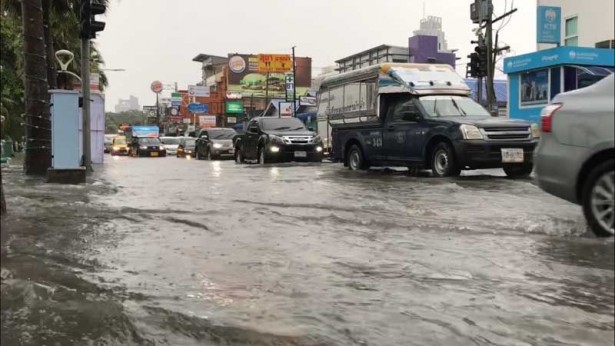 ช่วงบ่ายที่ผ่านมา เกิดฝนตกลงมาอย่างหนักและต่อเนื่องนานกว่า 2 ชั่วโมง ในเขตตัวเมืองพัทยา อ.บางละมุง จ.ชลบุรี ทำให้เกิดน้ำท่วมขังหลายจุด ส่งผลการสัญจรเป็นไปด้วยความยากลำบาก บางจุดถูกตัดขาดไม่สามารถผ่านไปได้ โดยเฉพาะเป็นวันหยุด ปริมาณรถจึงมากกว่าวันปกติ จากการตรวจสอบ บริเวณถนนเลียบชายหาดพัทยา ยาวไปถึงถนนวอล์คกิ้งสตรีท ย่านพัทยาใต้ ถนนตลอดสายมีน้ำท่วมสูง 30-50 ซม. ส่งผลให้รถยนต์ดับกลางถนนเสียหายหลายคัน เจ้าหน้าที่ อาสาสมัคร และพลเมืองดี ต้องลุยน้ำช่วยกันเข็นรถ ส่วนที่ถนนเลียบทางรถไฟ ซอยเขาตาโล ซึ่งเป็นพื้นที่ลักษณะคล้ายแอ่งกระทะ ซึ่งเป็นจุดที่น้ำท่วมขังทุกครั้งที่ฝนหนัก ปริมานน้ำท่วมสูงถึงกว่า 1 เมตร จนทะลักเข้าบ้านเรือนประชาชนที่อยู่ริมถนน และการจราจรถูกตัดขาดโดยสิ้นเชิง เจ้าหน้าที่ปิดกั้นเส้นทาง พร้อมอำนวยสะดวก และเร่งระบายน้ำ อย่างไรก็ตาม หลังฝนหยุดตกแล้ว ประมาณ 1 ชั่วโมง คาดว่าระดับน้ำจะลดลงจนเข้าสู่สภาวะปกติต่อไป ส่วนในกรุงเทพมหานคร ฟ้าครึ้มและมีฝนตกตั้งแต่ช่วงบ่ายที่ผ่านมาเช่นกัน โดยล่าสุด ฝนตกปานกลาง เขตบางซื่อ บางพลัด พระนคร ดุสิต พญาไท ปทุมวัน ราชเทวี ดินแดง ห้วยขวาง ลาดพร้าว วังทองหลาง วัฒนา สวนหลวง บางกะปิ สะพานสูง ประเวศ หนองจอก ลาดกระบัง ต่อเนื่อง อ.บางพลี จ.สมุทปราการ เคลื่อนตัวทิศเหนือค่อนทิศตะวันตก ปริมาณฝนสูงสุดเขตห้วยขวาง 43.5 มม.