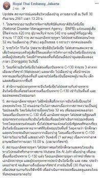 เมื่อเวลาประมาณ 14.30 น. เฟซบุ๊กสถานเอกอัครราชทูตไทย ณ กรุงจาการ์ตา ประเทศ อินโดนีเซีย เปิดเผยความคืบหน้าเหตุการณ์แผ่นดินไหวบนเมืองปาลู เกาะสุลาเวสี ประเทศอินโดนีเซีย ว่า โฆษกหน่วยงานบริหารจัดการภัยพิบัติแห่งชาติอินโดนีเซีย แจ้ง ยอดผู้เสียชีวิตจำนวน 420 ราย ผู้บาดเจ็บ 540 ราย และผู้ไร้ที่อยู่อาศัย 17,000 ราย สถานเอกอัครราชทูตไทยฯ ได้ประสานงานติดต่อนักศึกษาและคนไทยในเมืองปาลู รวมจำนวน 32 คน อยู่เป็นระยะๆ ทำให้ทราบว่าทุกคนปลอดภัย ขณะที่นายโจโก วิโดโด ประธานาธิบดีอินโดนีเซียได้ส่งสารแสดงความเสียใจต่อครอบครัวผู้เสียชีวิตและสั่งการ ให้ทางการอินโดนีเซียเร่งช่วยเหลือผู้ประสบภัย โดยมีกำหนดลงพื้นที่เยือนเมืองปาลู และเมืองดองกาลาในวันนี้ (30 ก.ย.) นอกจากนี้ รัฐบาลอินโดนีเซียส่งเครื่องบินทหารซี-130 จำนวน 3 ลำ จากเมืองมากัสซาร์ และมาลัง ไปที่เมืองปาลู เพื่อนำหน่วยทหารและทีมกู้ภัยลงพื้นที่ รวมถึงจะใช้เครื่องบินนี้ อพยพผู้บาดเจ็บ เด็ก และสตรีออกจากพื้นที่ด้วย ดังนั้น สำนักงานผู้ช่วยทูตทหารประจำ อินโดนีเซียได้ประสานกับฝ่ายทหารอินโดนีเซียเพื่อขอโดยสารเครื่องบินทหารซี-130 เข้าไป ในพื้นที่และอพยพคนไทยออกมา ขณะที่สถานเอกอัครราชทูตไทยฯ ได้มีหนังสือถึงทางการ อินโดนีเซียแจ้งชื่อคนไทย 32 คน ในการขออพยพออกมาโดยเครื่องบินดังกล่าว นายทรงพล สุขจันทร์ เอกอัครราชทูตไทยฯ ได้ประสานงานกับรัฐมนตรีช่วยว่าการกระทรวง การท่องเที่ยวอินโดนีเซีย เพื่อขอให้เร่งช่วยเหลือคนไทย โดยคาดว่าคนไทยกลุ่มนี้จะเดินทาง โดยเครื่องบินทหารออกจากเมืองปาลูได้ภายในบ่ายวันนี้ และอย่างช้าวันพรุ่งนี้ (1 ต.ค.) เนื่องจากท่าอากาศยานจะปิดทำการเวลา 18.00 น.ตามเวลาของเมืองมากัสซาร์ ทั้งนี้ สถานเอกอัครราชทูตไทยฯ ประกาศขอให้คนไทยกลุ่มนี้ไปรวมตัวที่ท่าอากาศยาน มูเทียรา ซิส อัล จูฟรี เมืองปาลู เพื่อรอขึ้นเครื่องบินทหารแล้ว โดยนายทรงพล เจ้าหน้าที่ สถานเอกอัครราชทูตไทยฯ และผู้ช่วยทูตทหารประจำอินโดนีเซีย และกงสุลกิตติมศักดิ์ ณ เมืองเดนปาซาร์ จะเดินทางถึงเมืองมากัสซาร์ ภายในวันนี้ เพื่อประสานงานกับบริษัท ซีพี ในการช่วยเหลือและดูแลคนไทยที่อพยพออกมาต่อไป