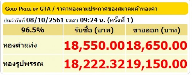 สมาคมค้าทองคำ ประกาศราคาซื้อขายทองคำ ประจำวันที่ 8 ต.ค.61 เปิดตลาด ลดลง 50 บาท ทองแท่ง รับซื้อ 18,550.00 บาท ขายออก 18,650.00 บาท รูปพรรณ รับซื้อ 18,222.32 บาท ขายออก 19,150.00 บาท